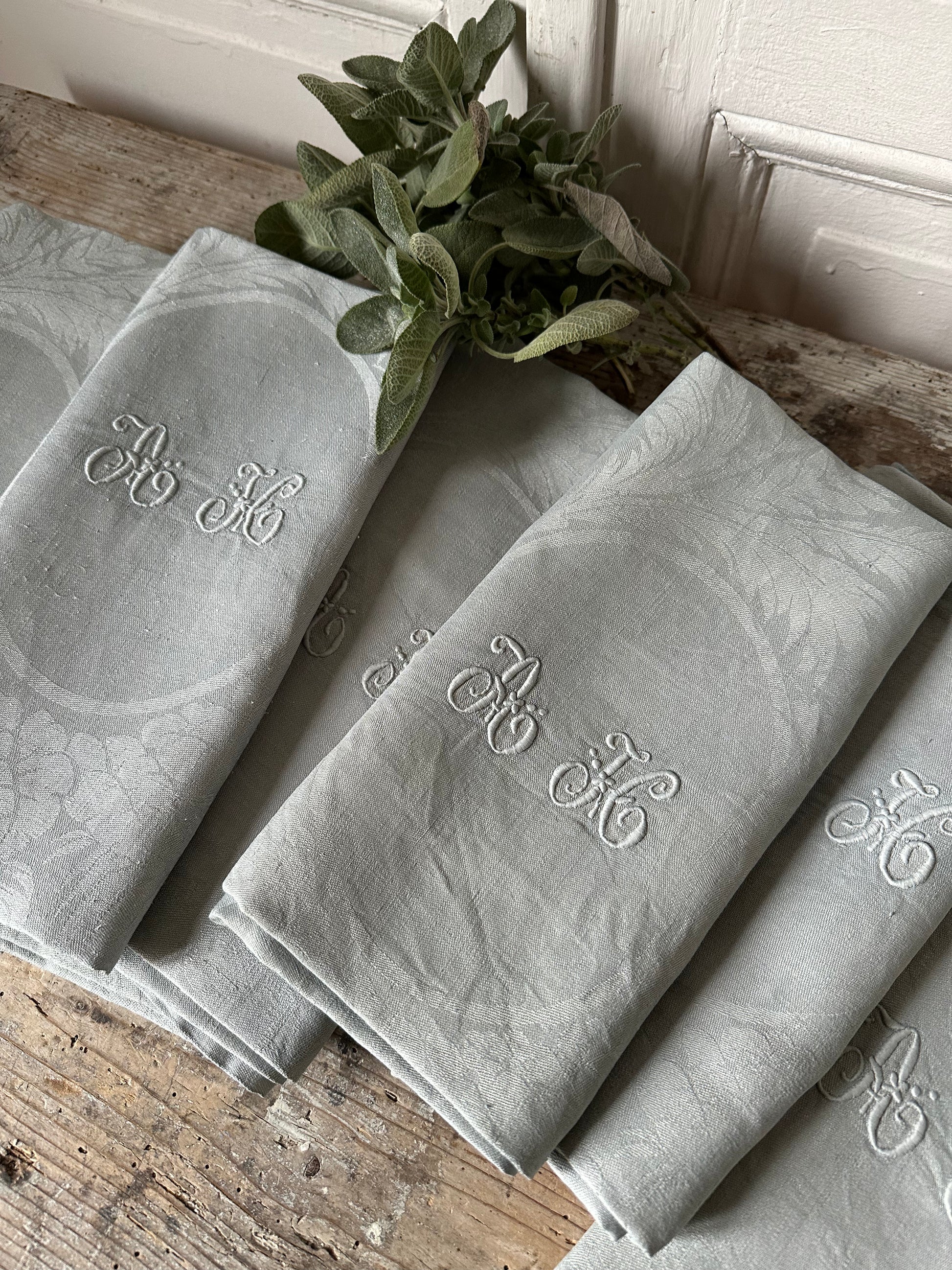 Ensemble de 10 serviettes anciennes à monogramme teintées céladon