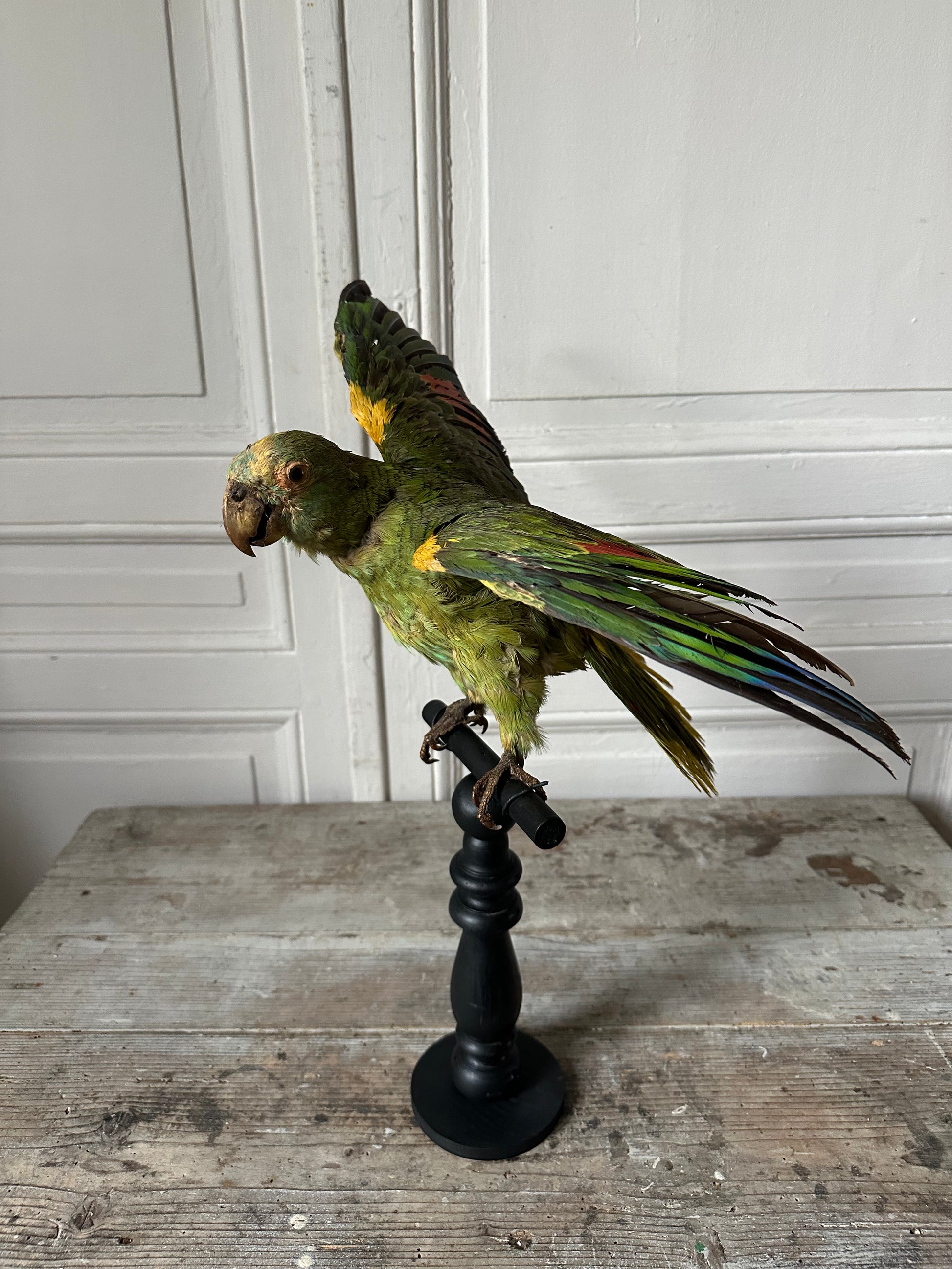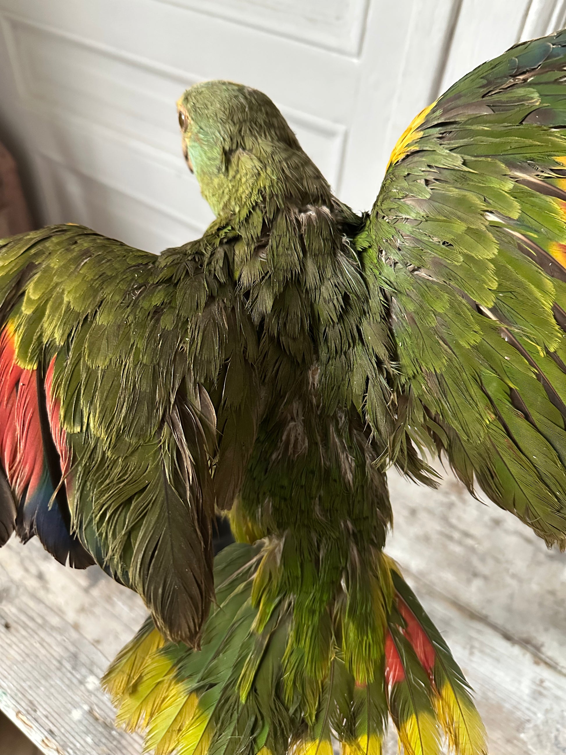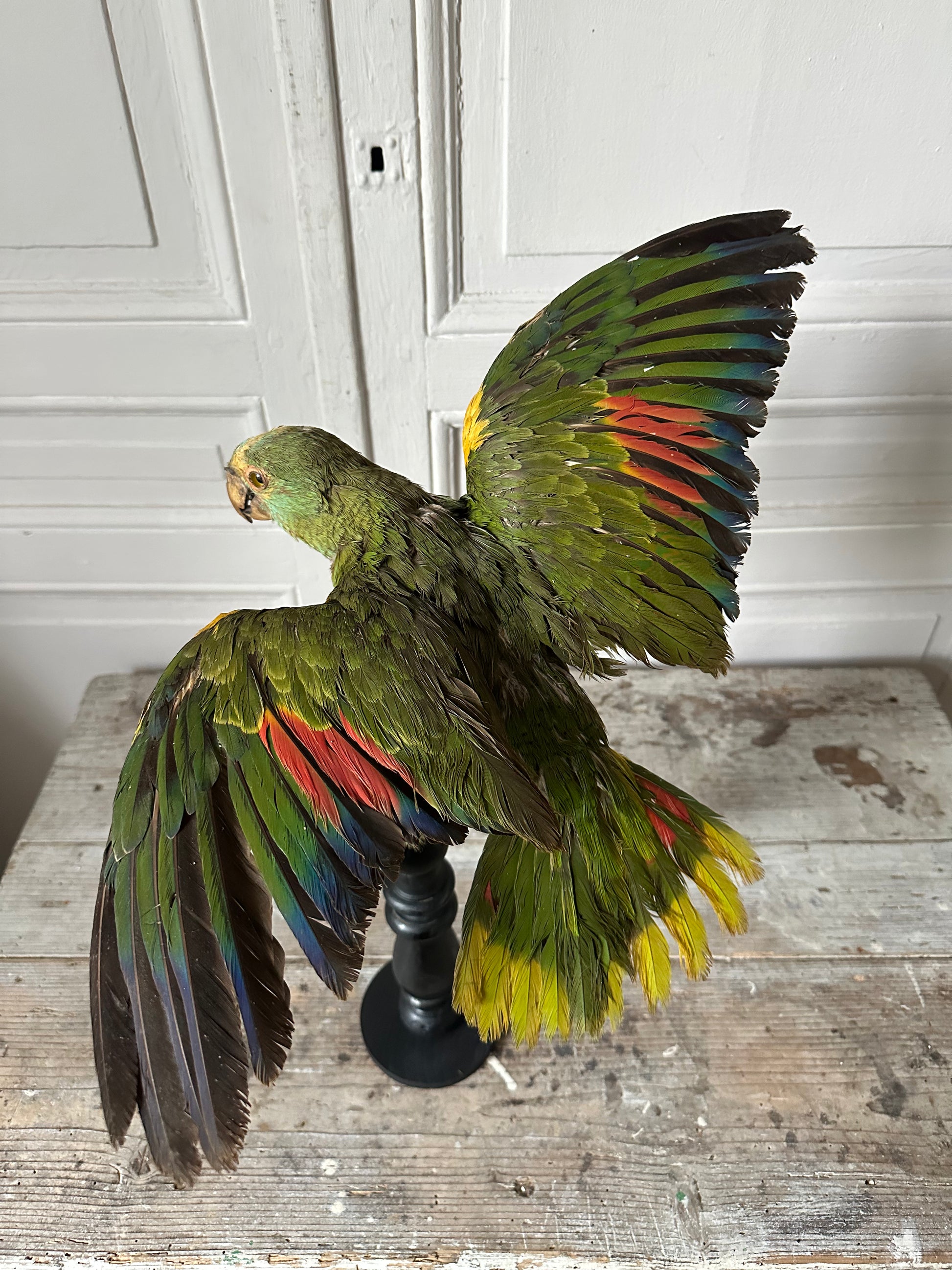 Ancienne taxidermie de ara sur son socle en bois tourné époque Napoléon