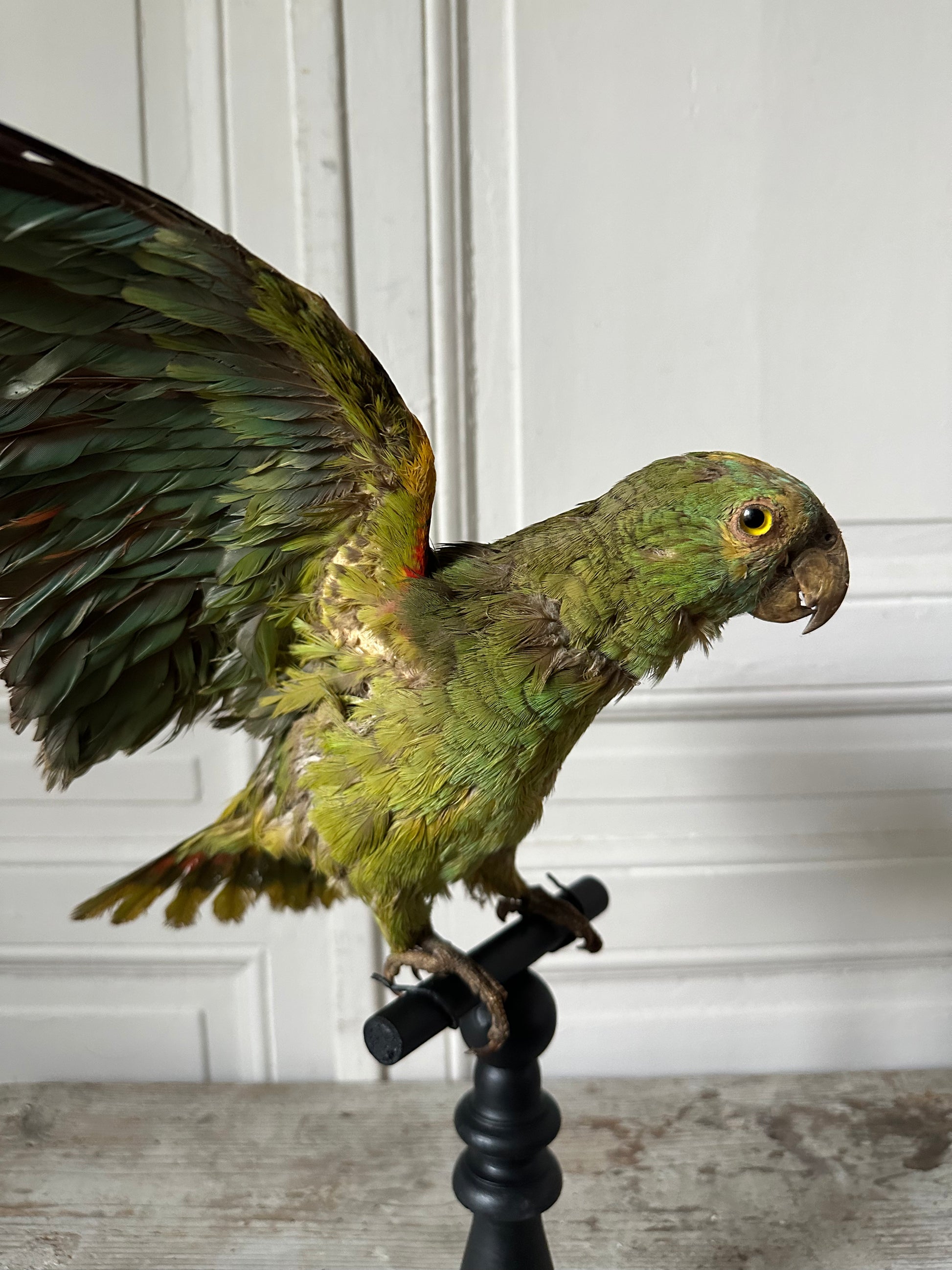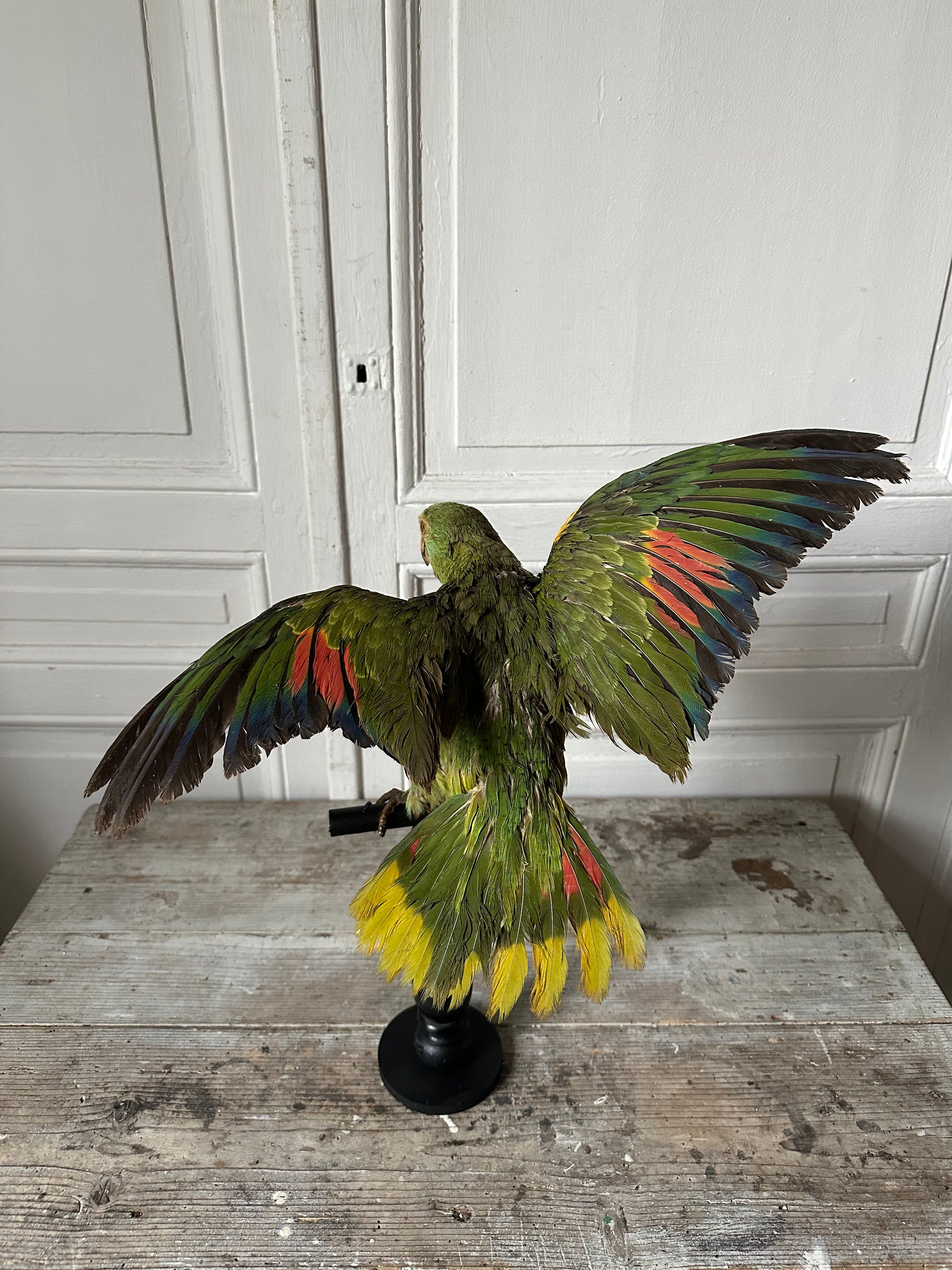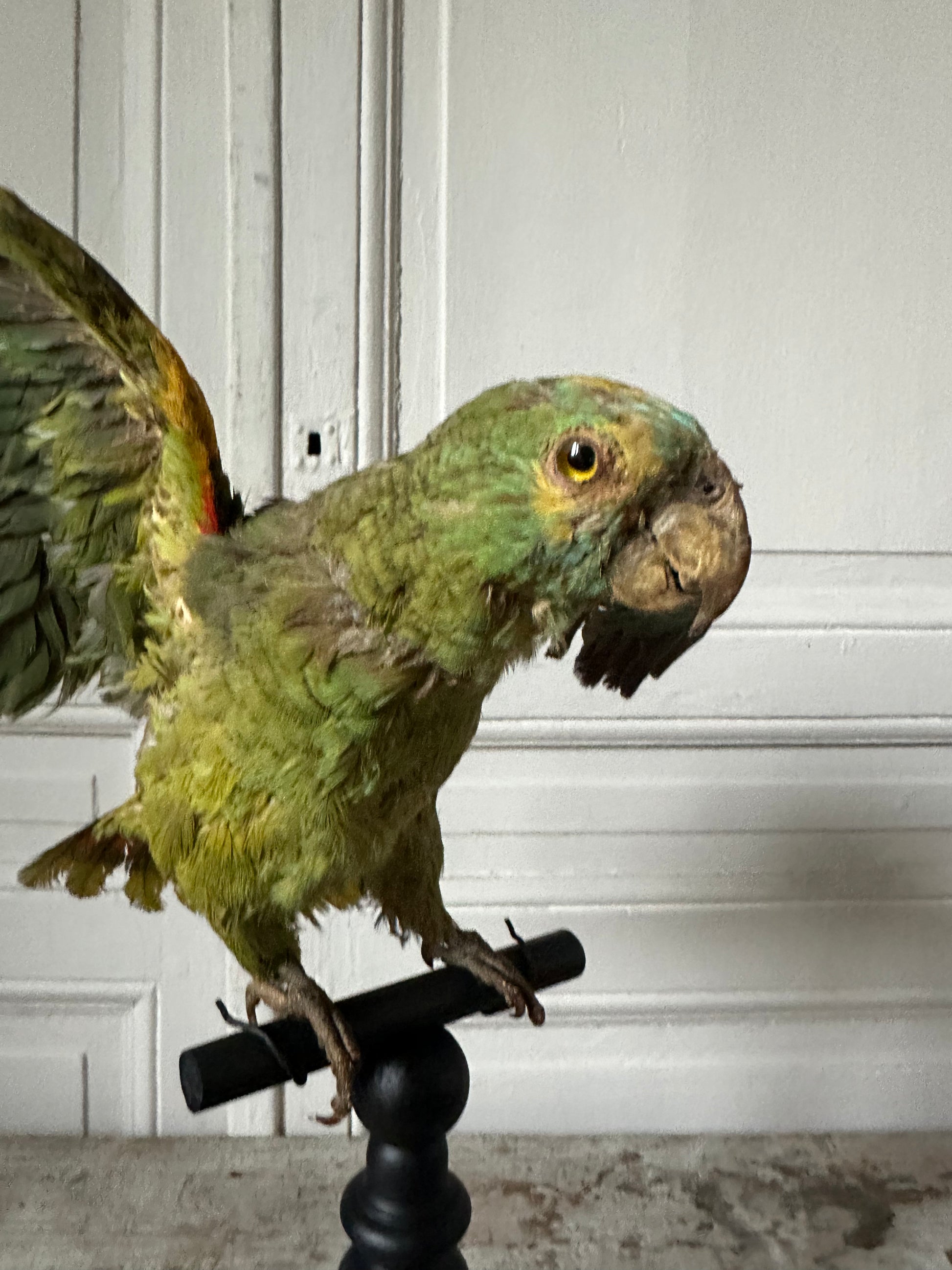 Ancienne taxidermie de ara sur son socle en bois tourné époque Napoléon