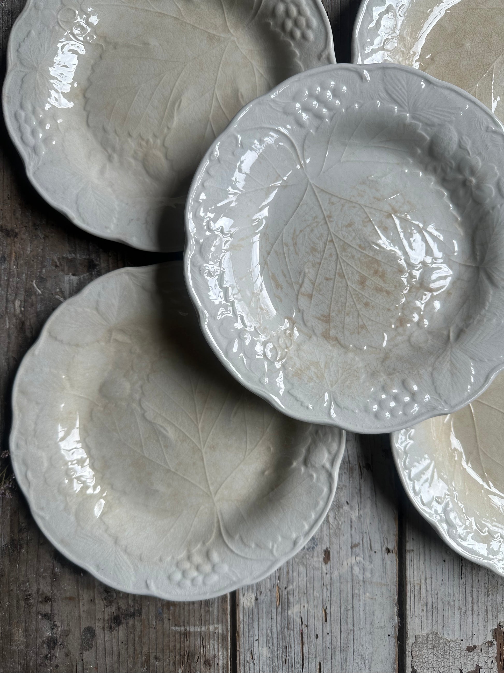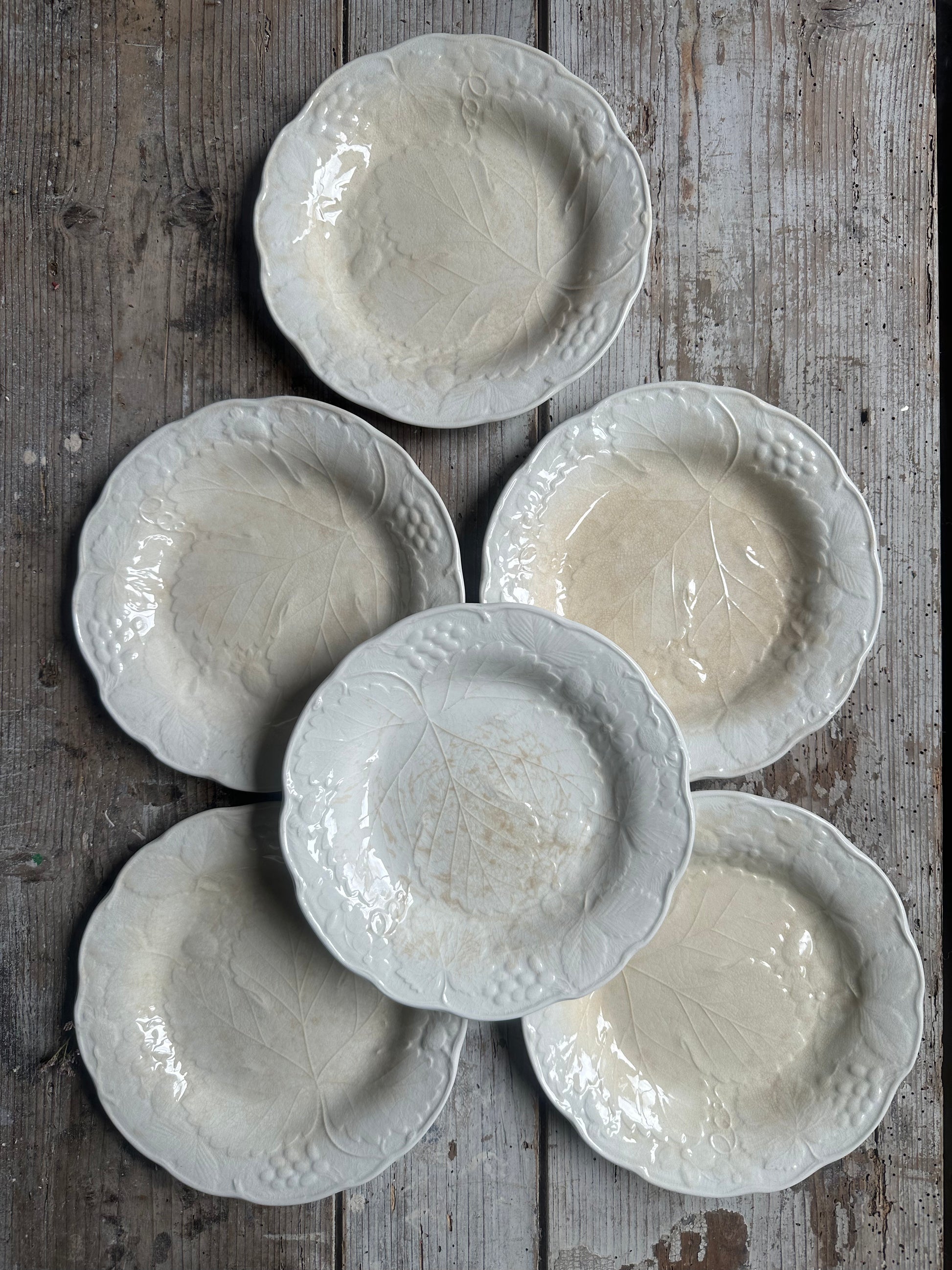 Ensemble de 6 assiettes à dessert en barbotine blanche patinée.
