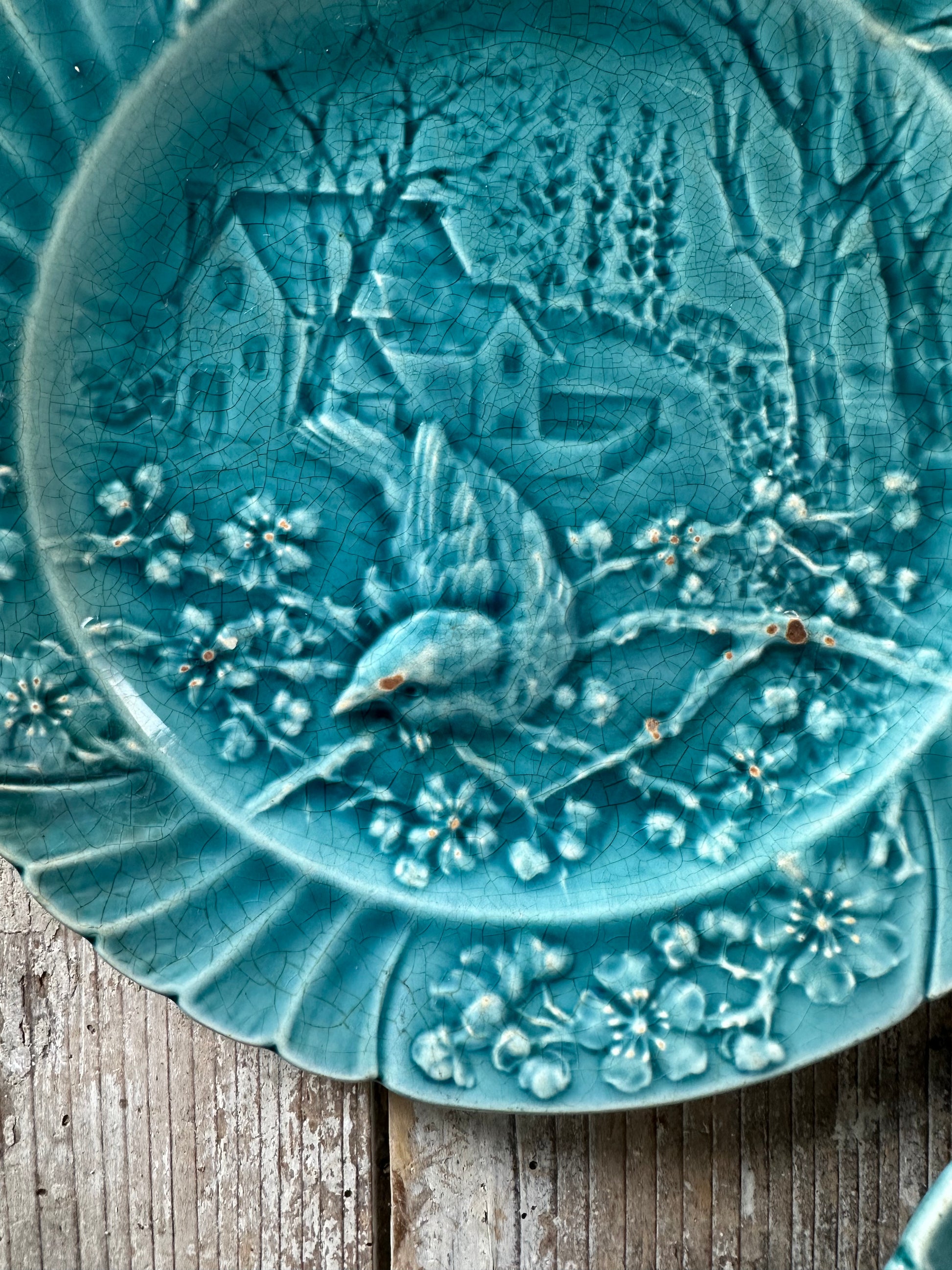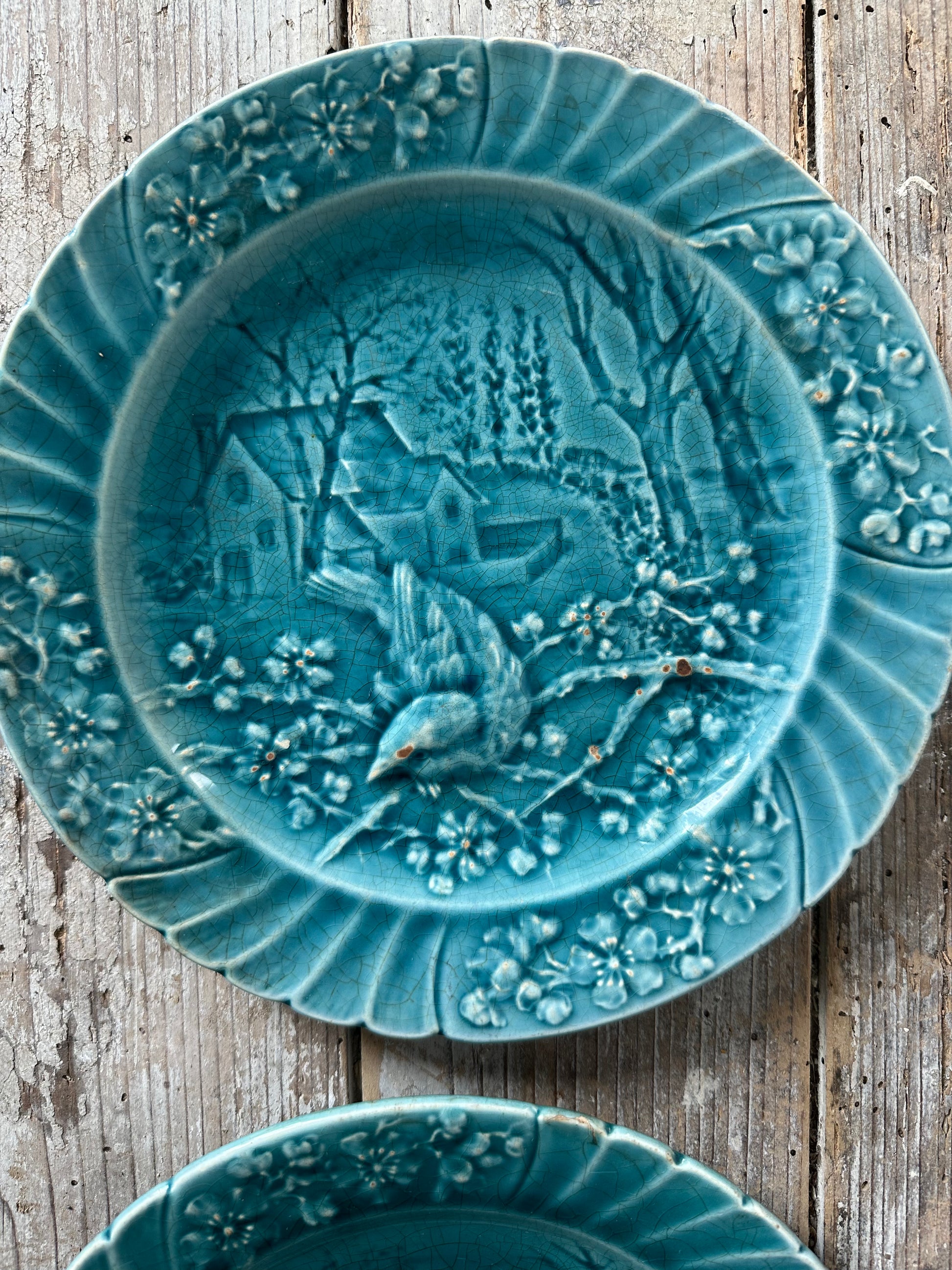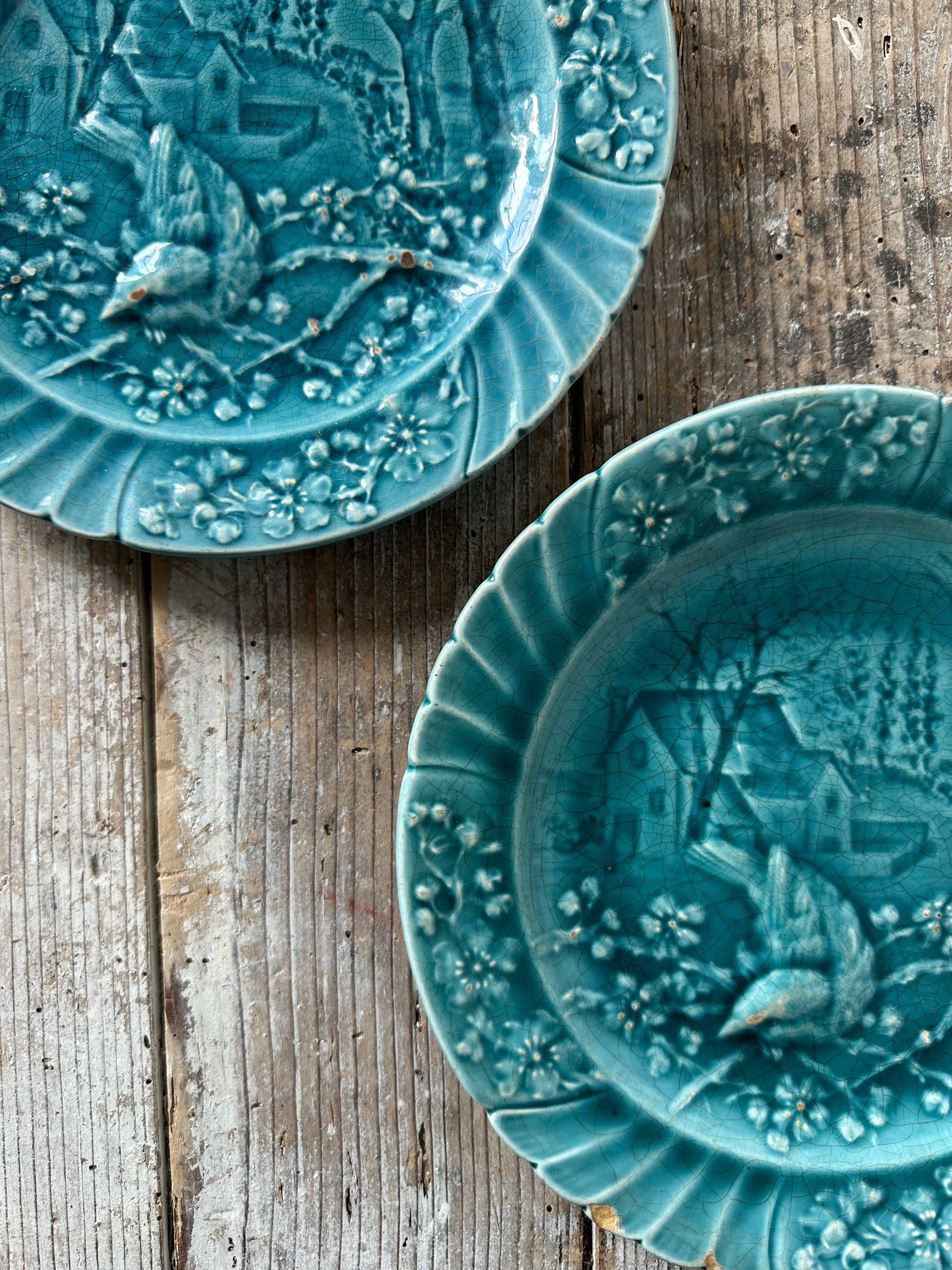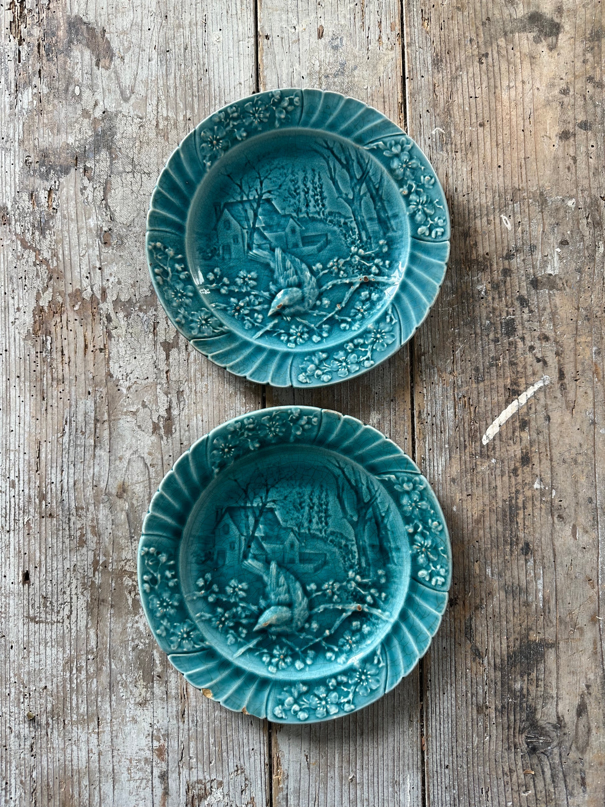 Deux assiettes en barbotine turquoise au motif d’oiseaux et de paysage