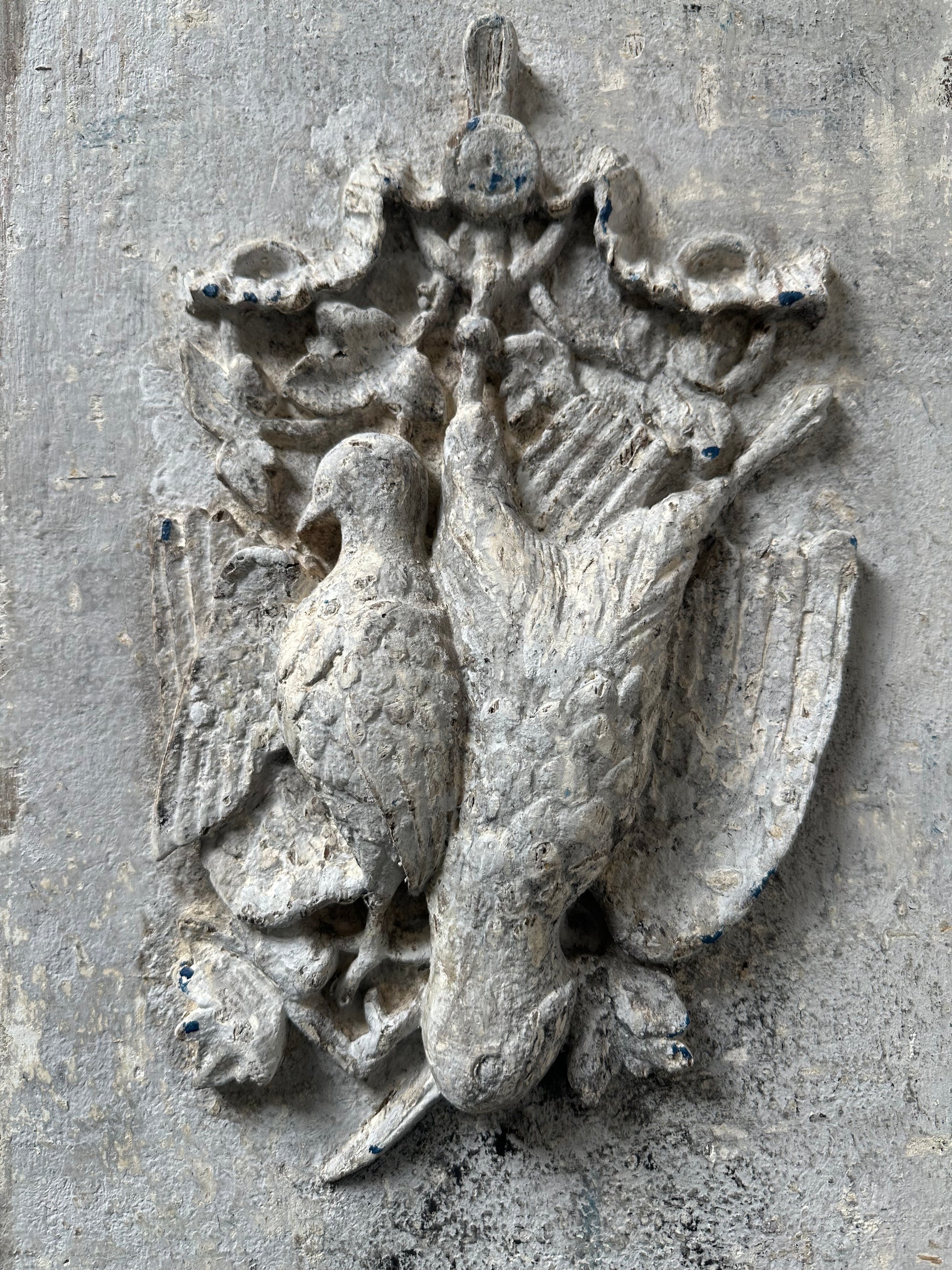 Travail moulé ancien ), probablement fin XIXᵉ – début XXᵉ siècle. Belle patine blanche, grise et touches de bleus.
