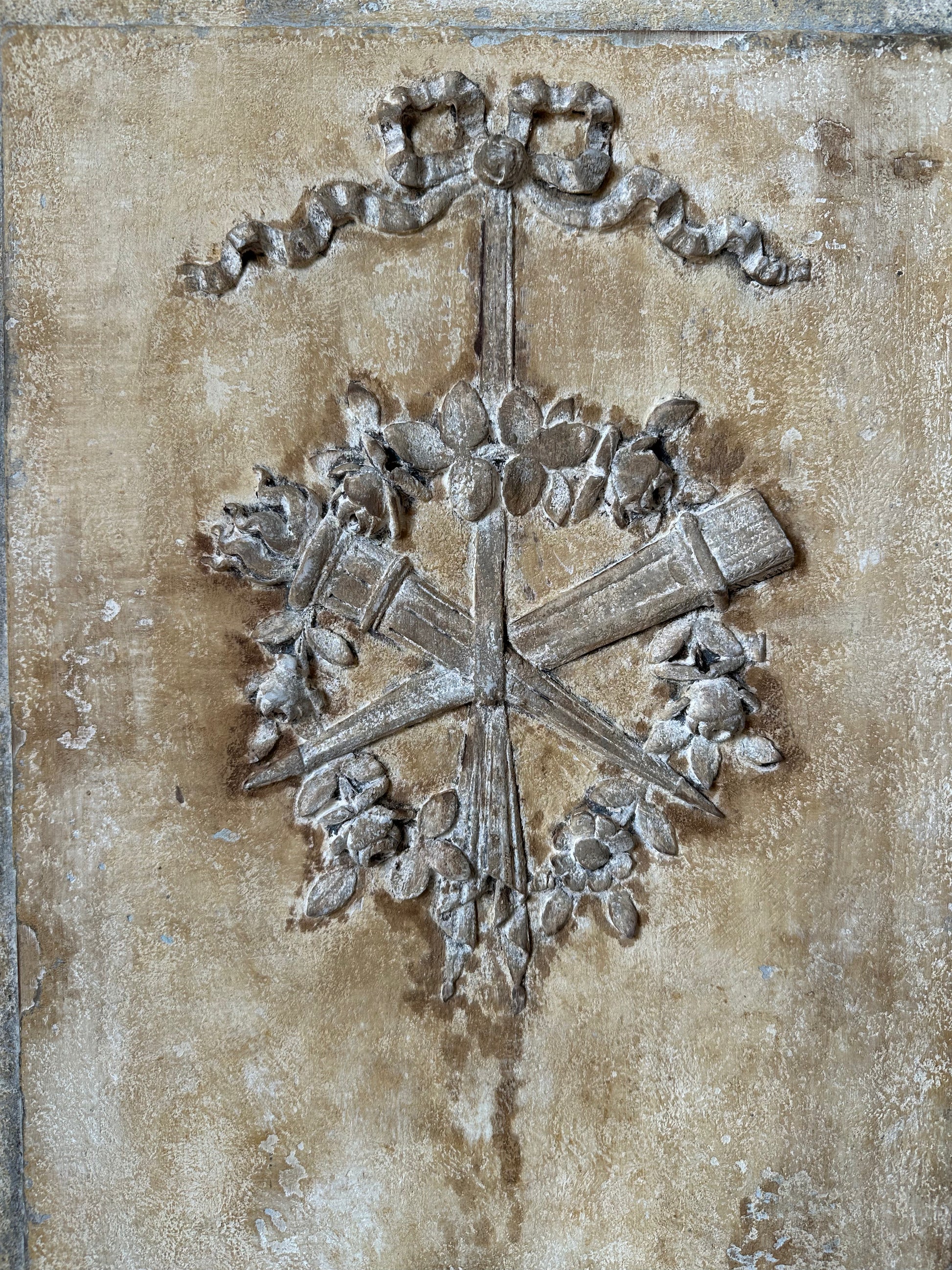 Ancien panneau en bois sculpté d’une couronne florale et surmontées d’un nœud décoratif.