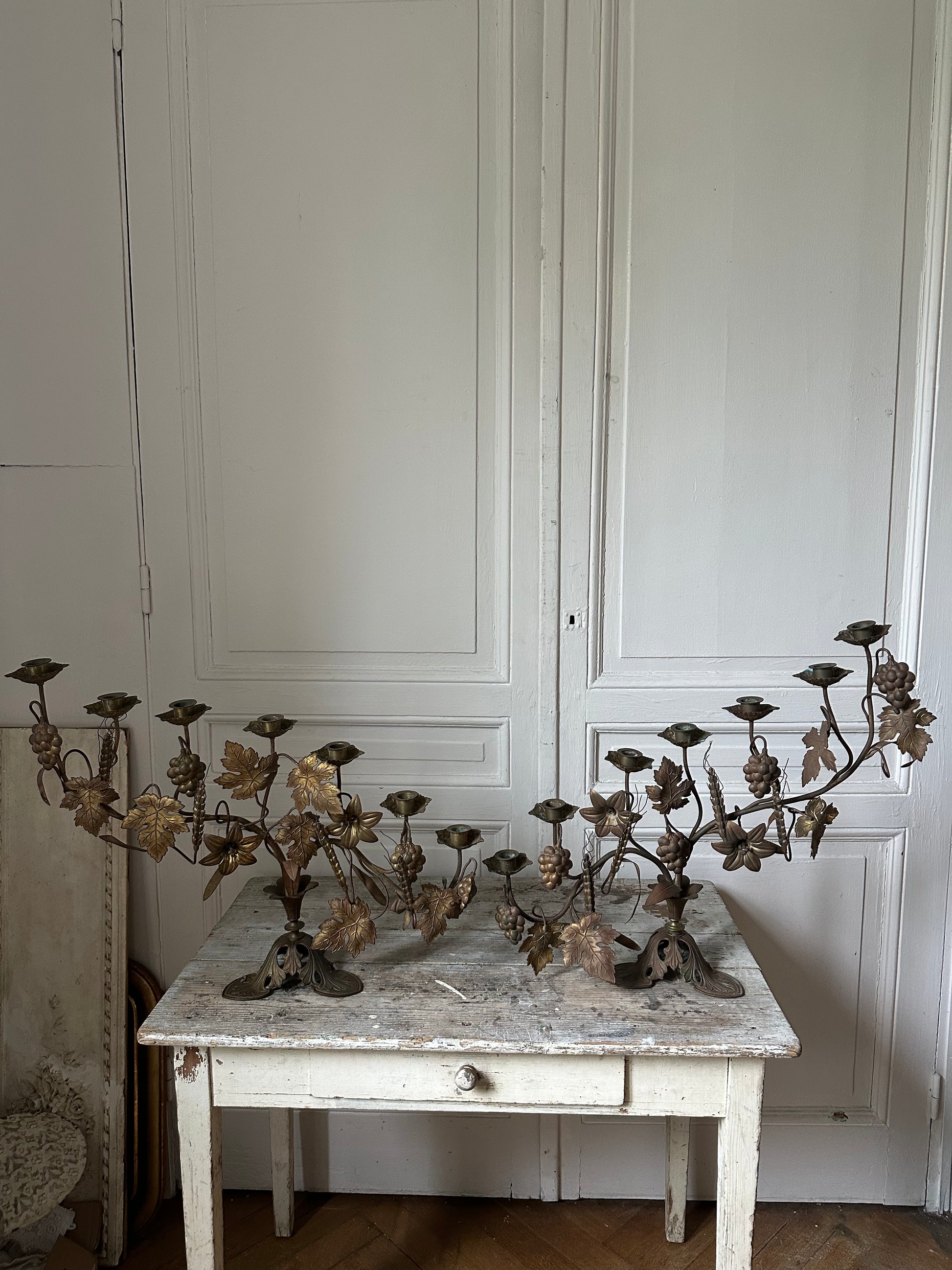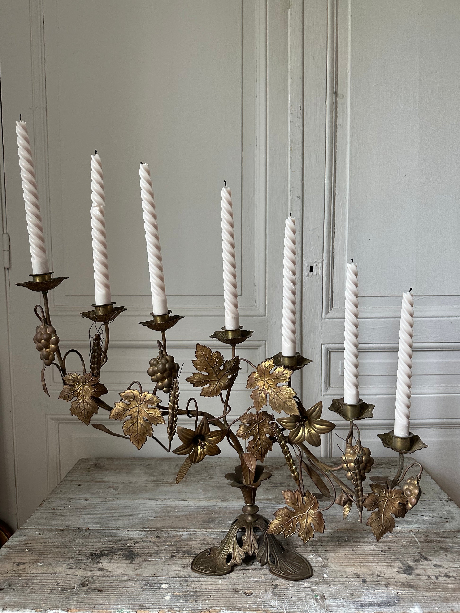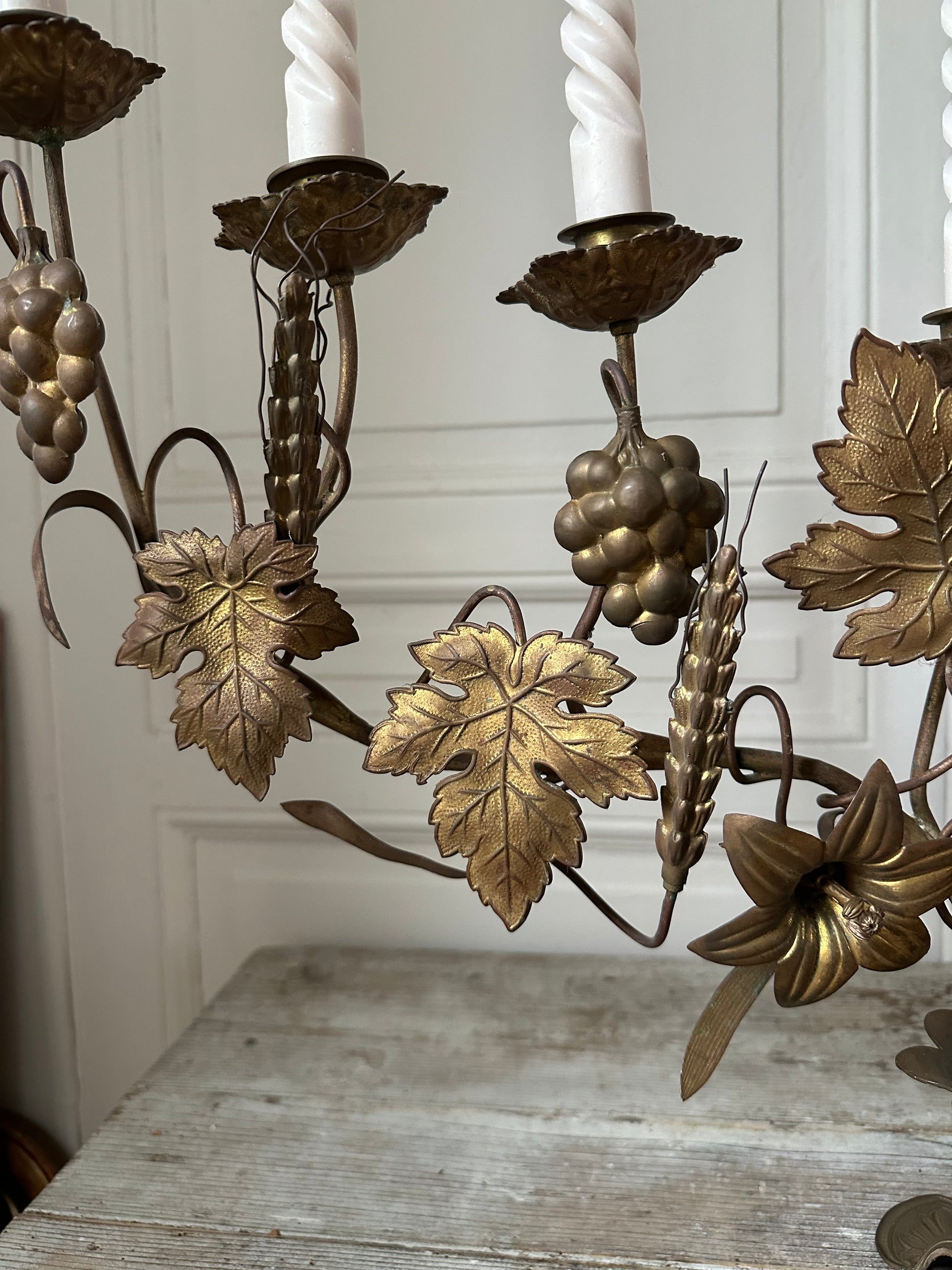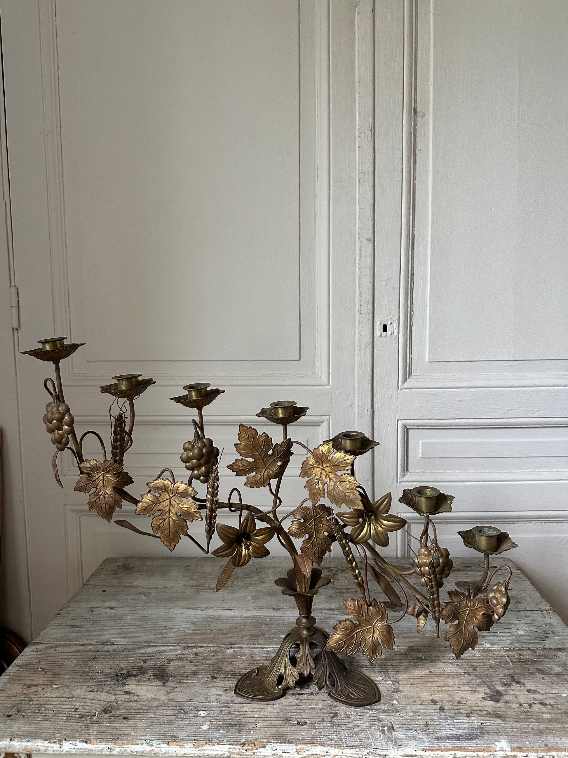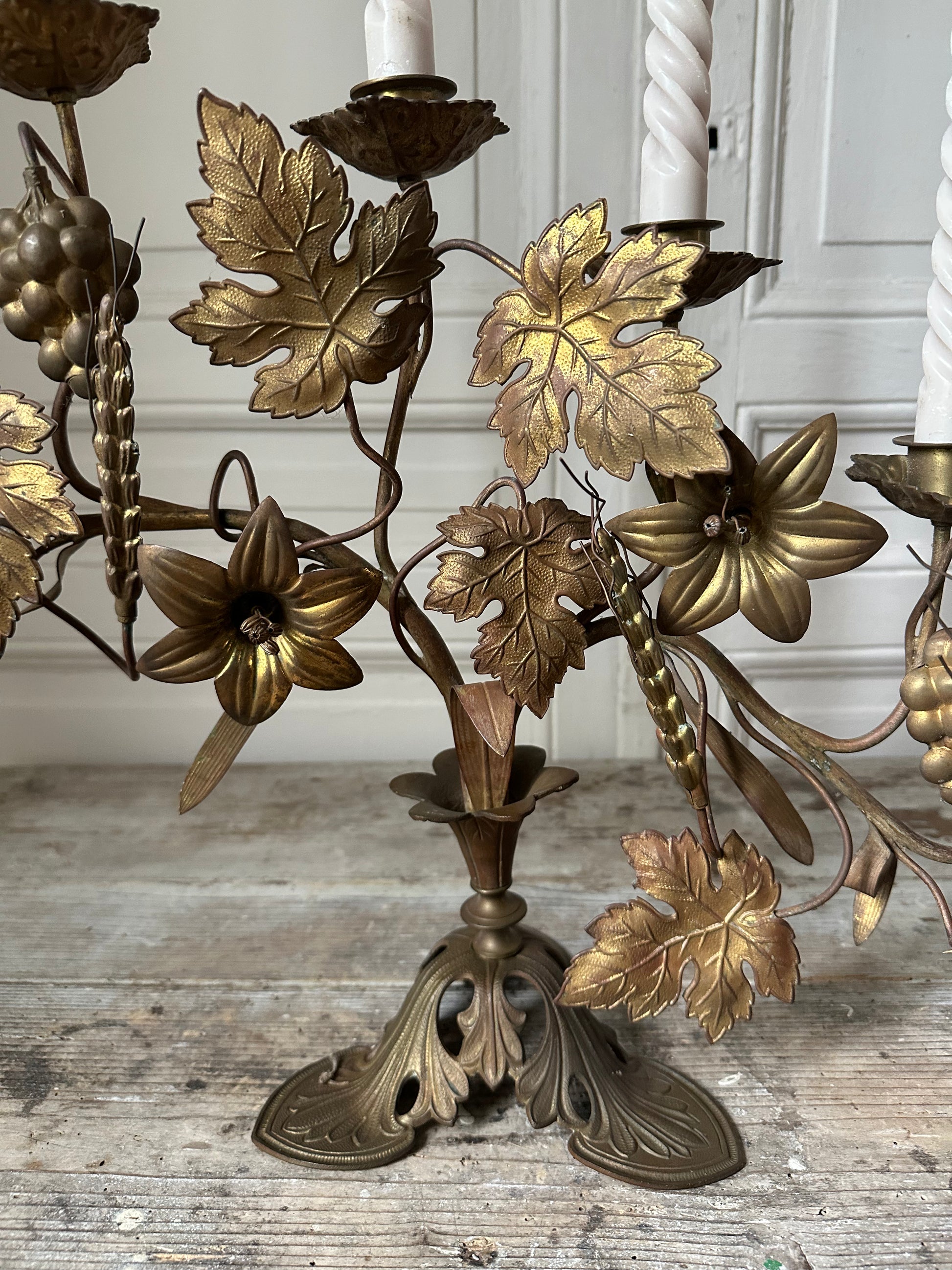 Imposant bougeoir d’église en laiton à motifs de feuilles de vigne, raisin et épi de blé
