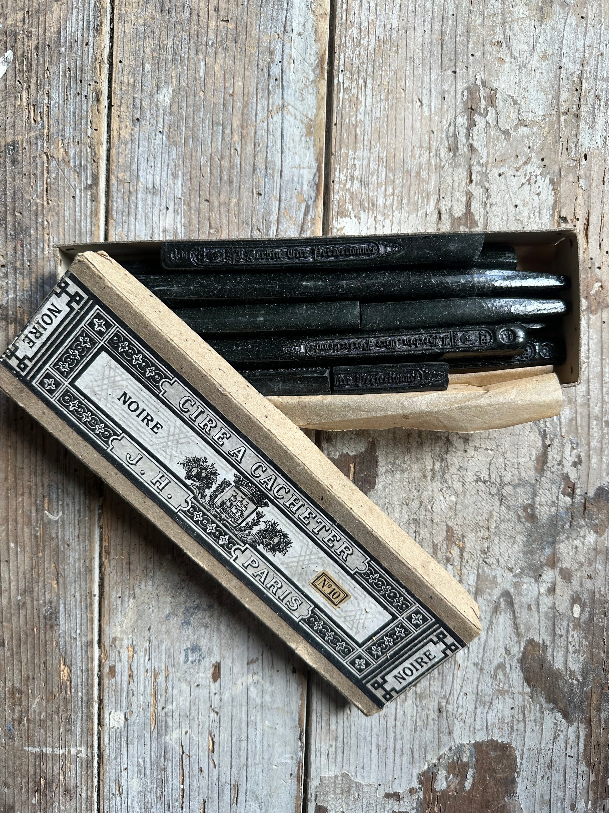 Ancienne boîte de cire à cacheter noire J. H. Paris, conservée avec ses bâtons d’origine.