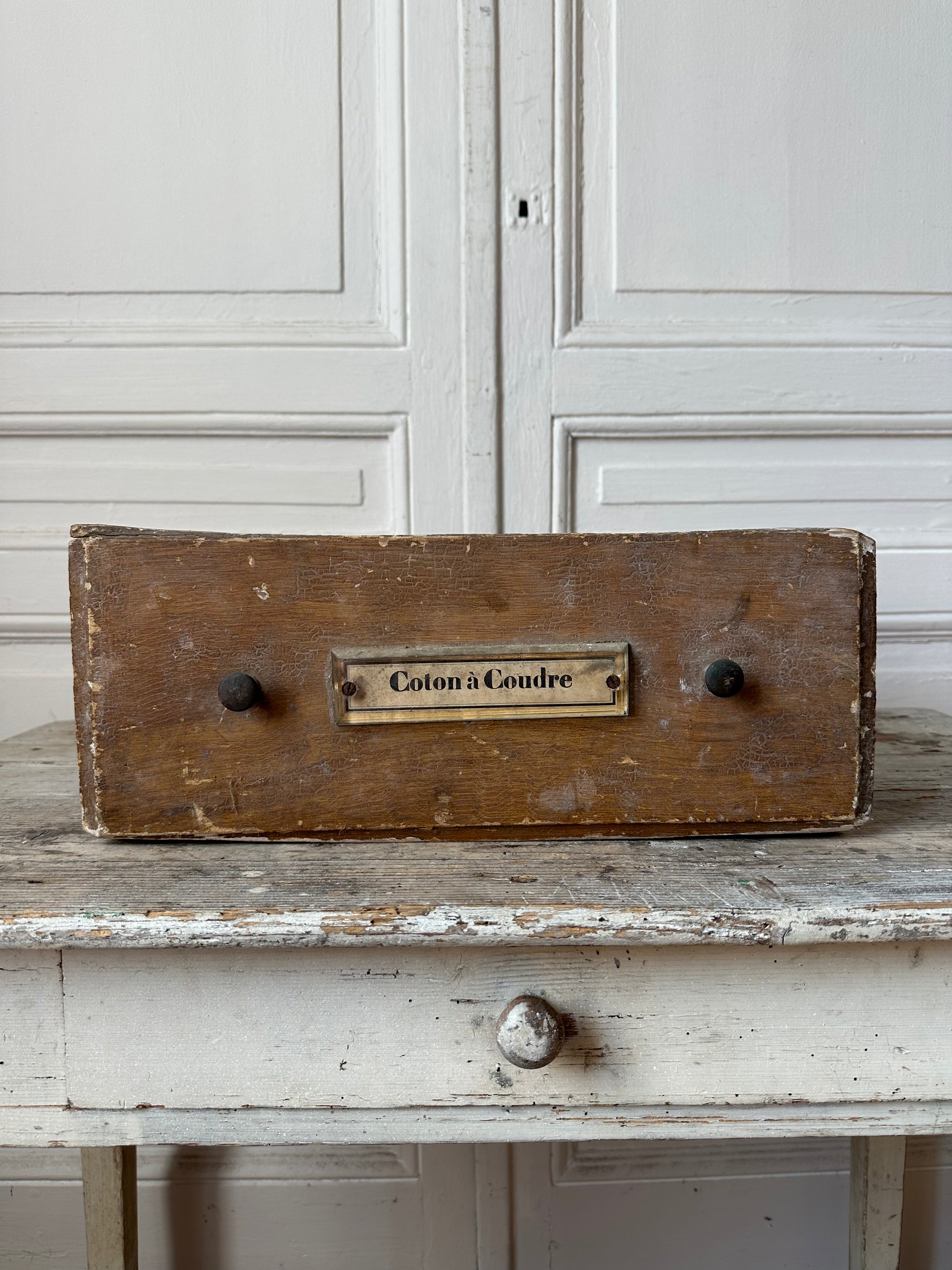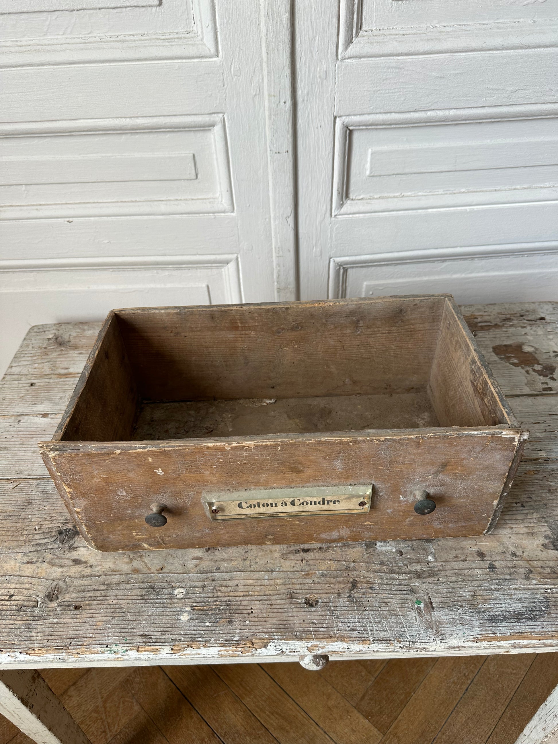 Ancien tiroir de meuble de mercerie en bois