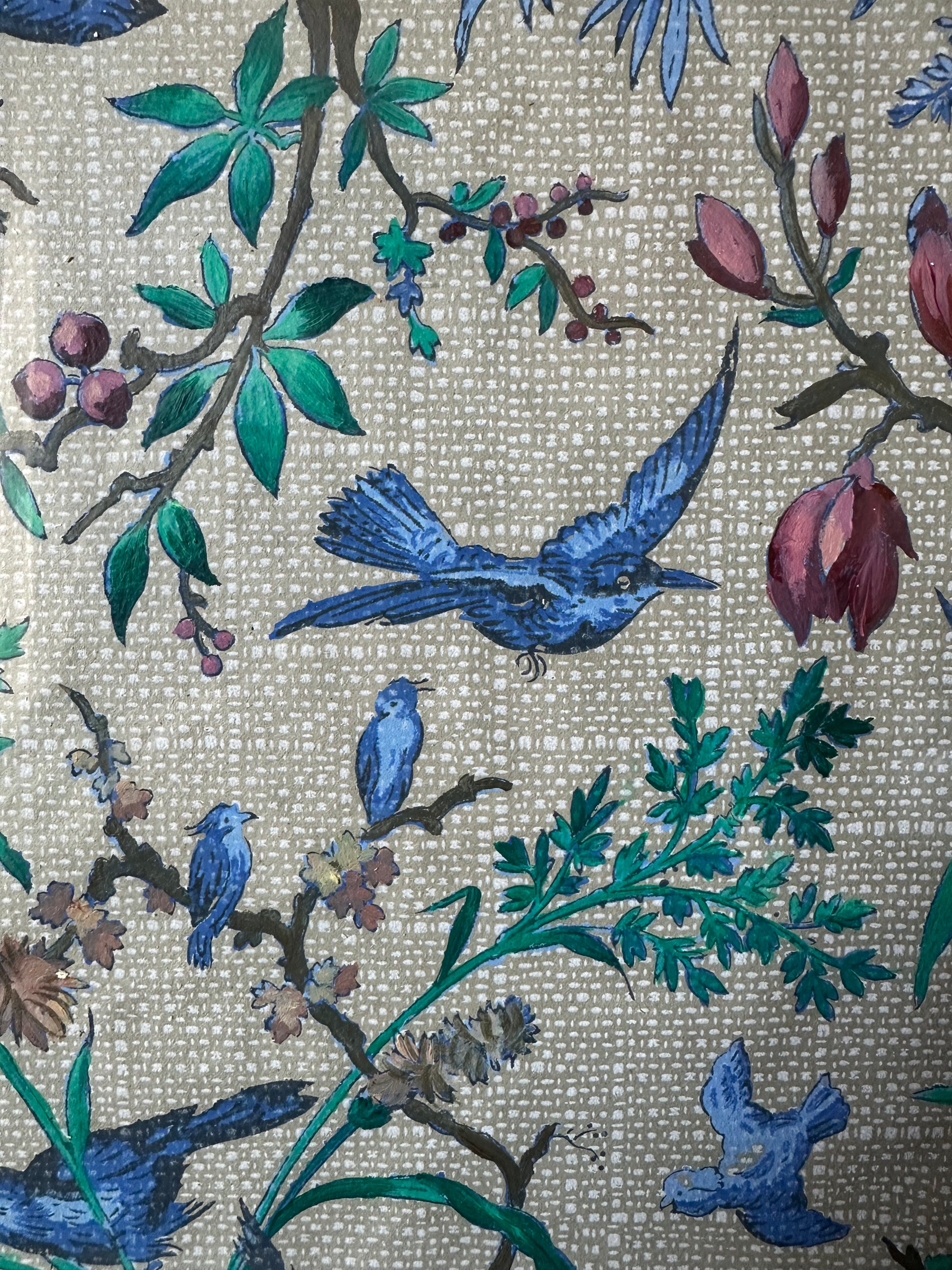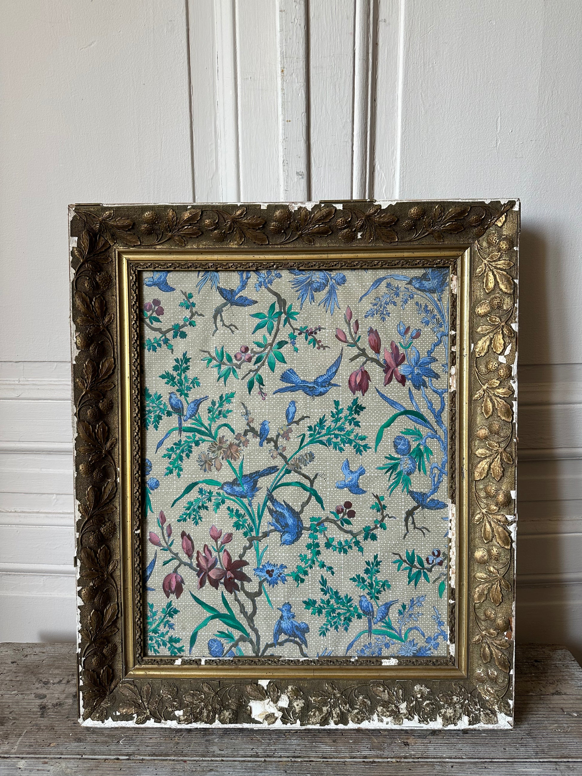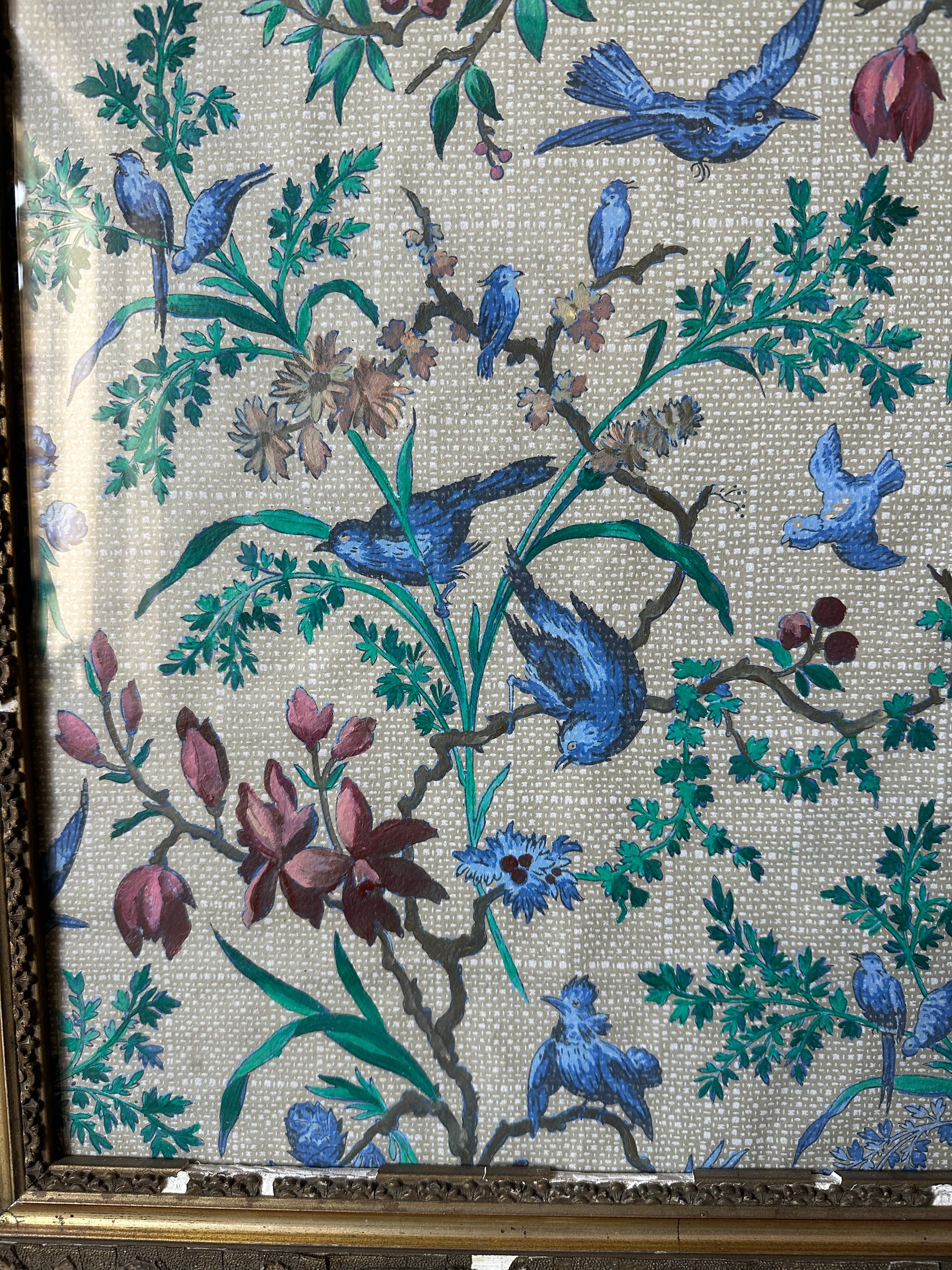 Magnifique papier peint XIX eme peint à la gouache et encadré sous verre