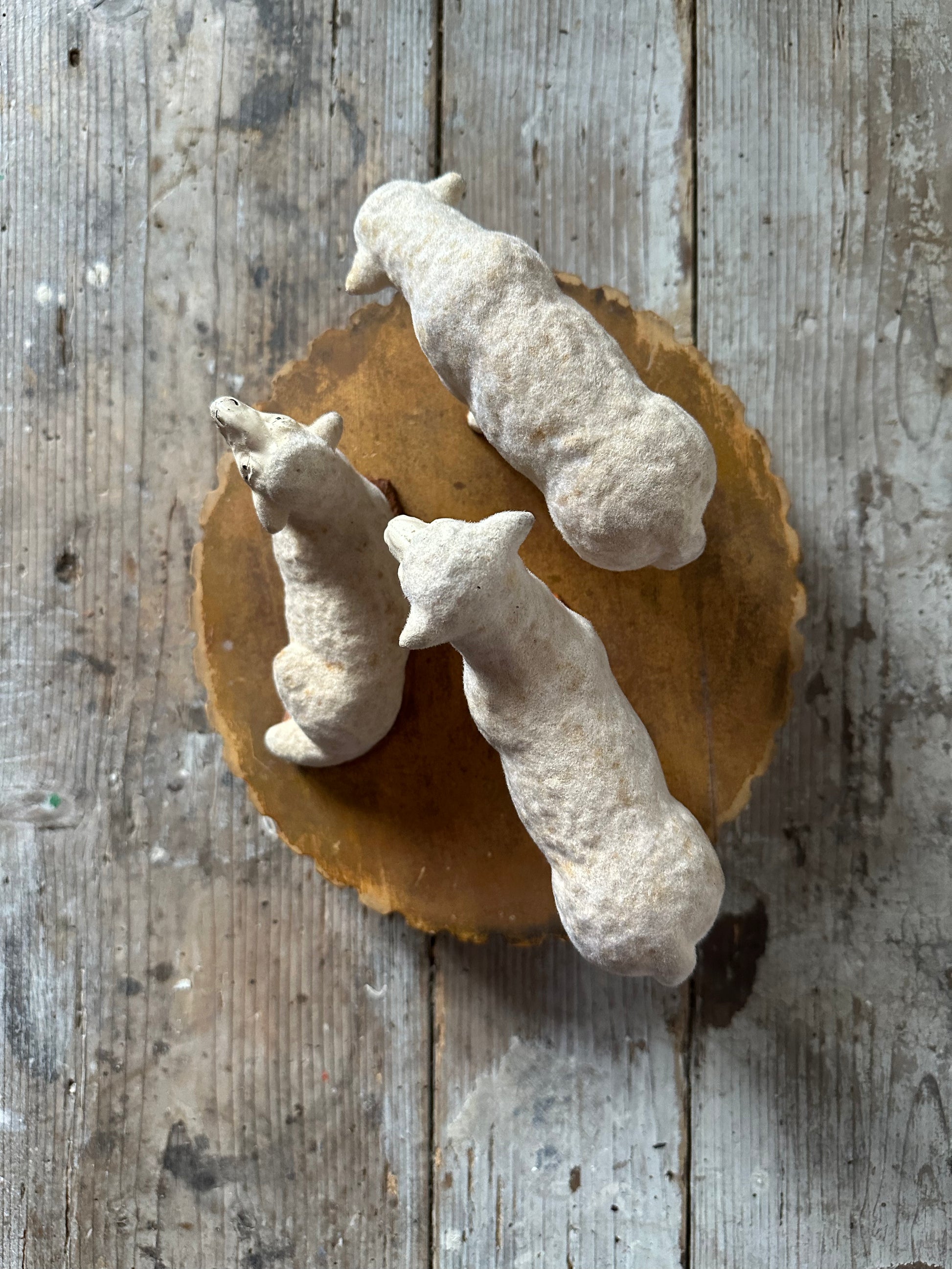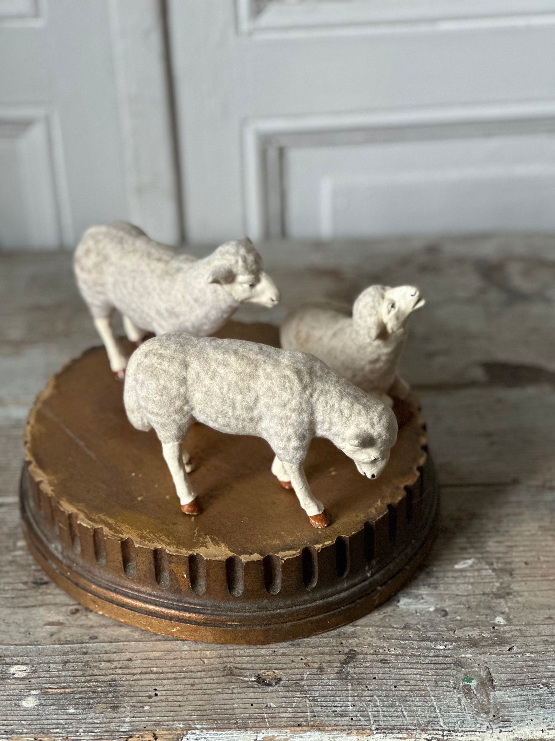 Ensemble de trois moutons anciens en plâtre floqués sur piédestal en bois doré.
