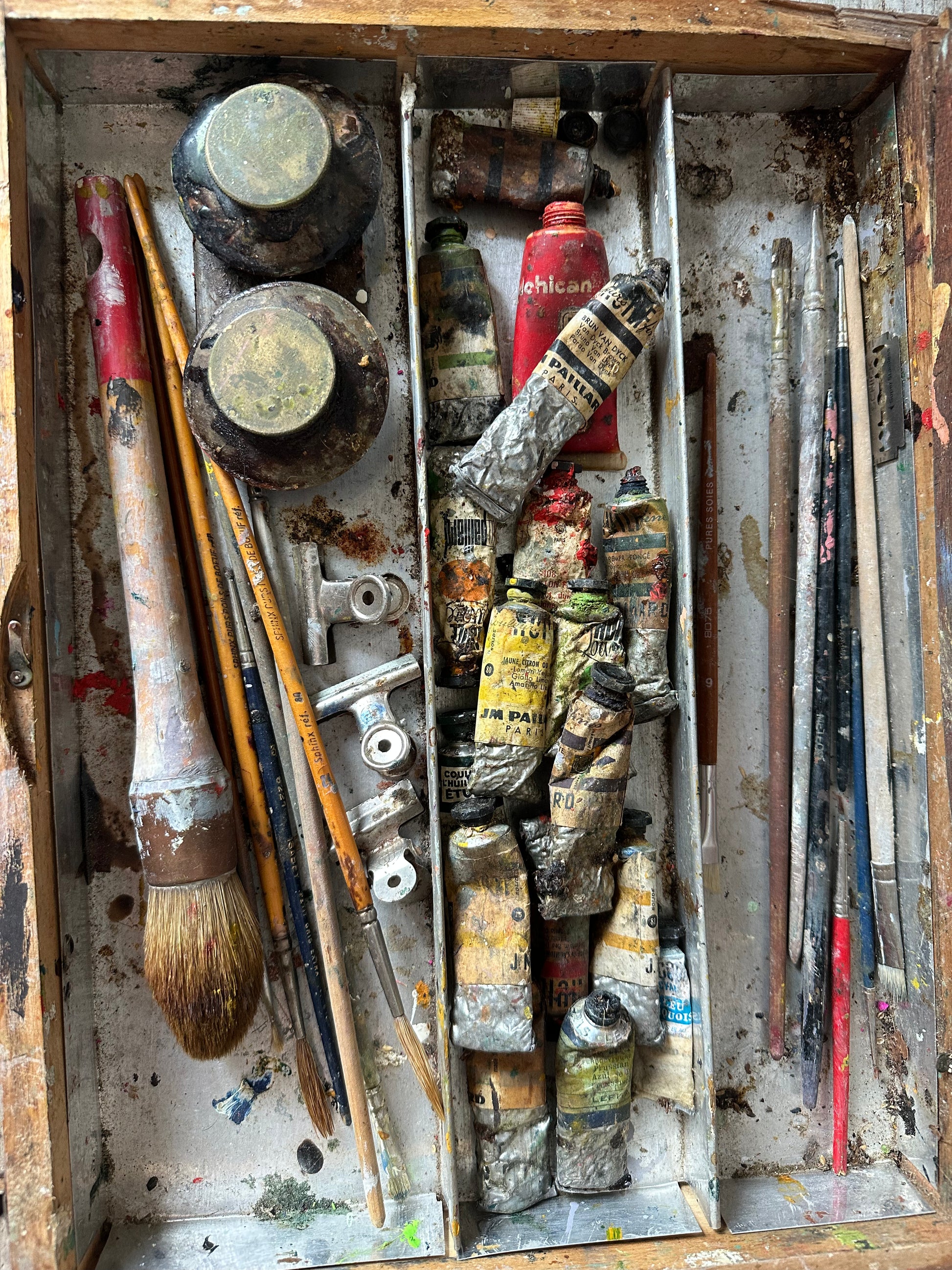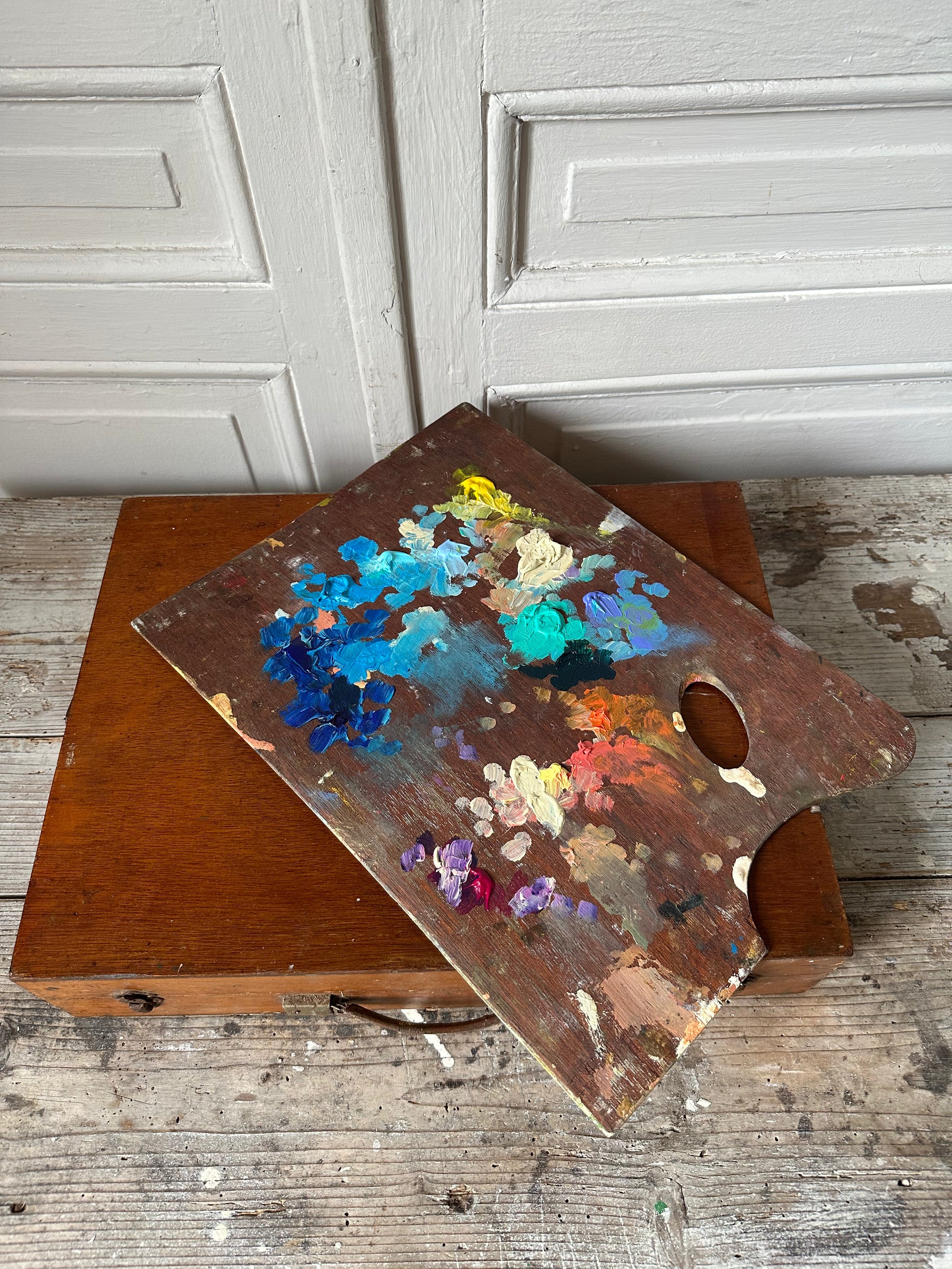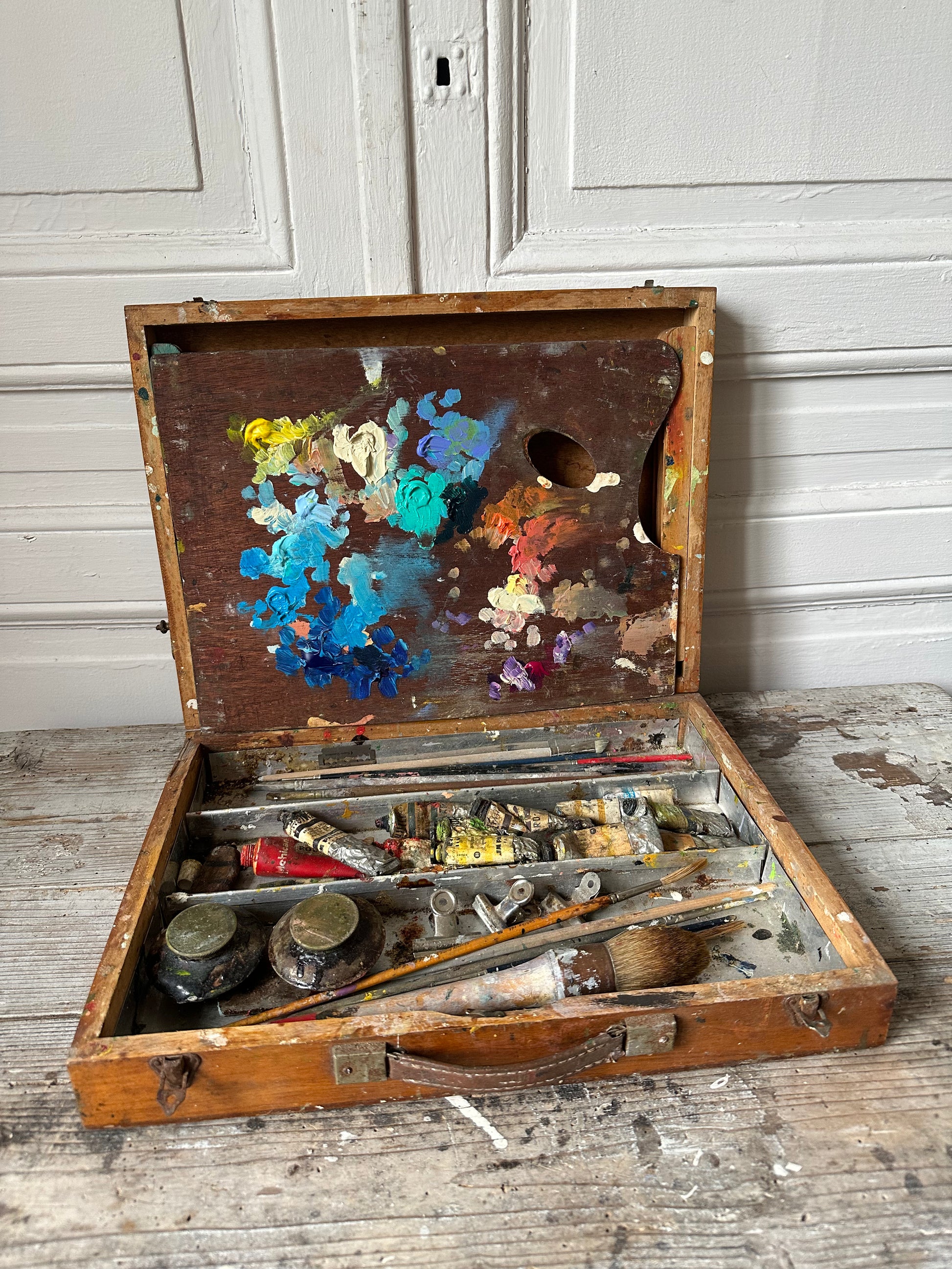 Ancienne malette de peinture avec quelques tubes usagés et pinceaux