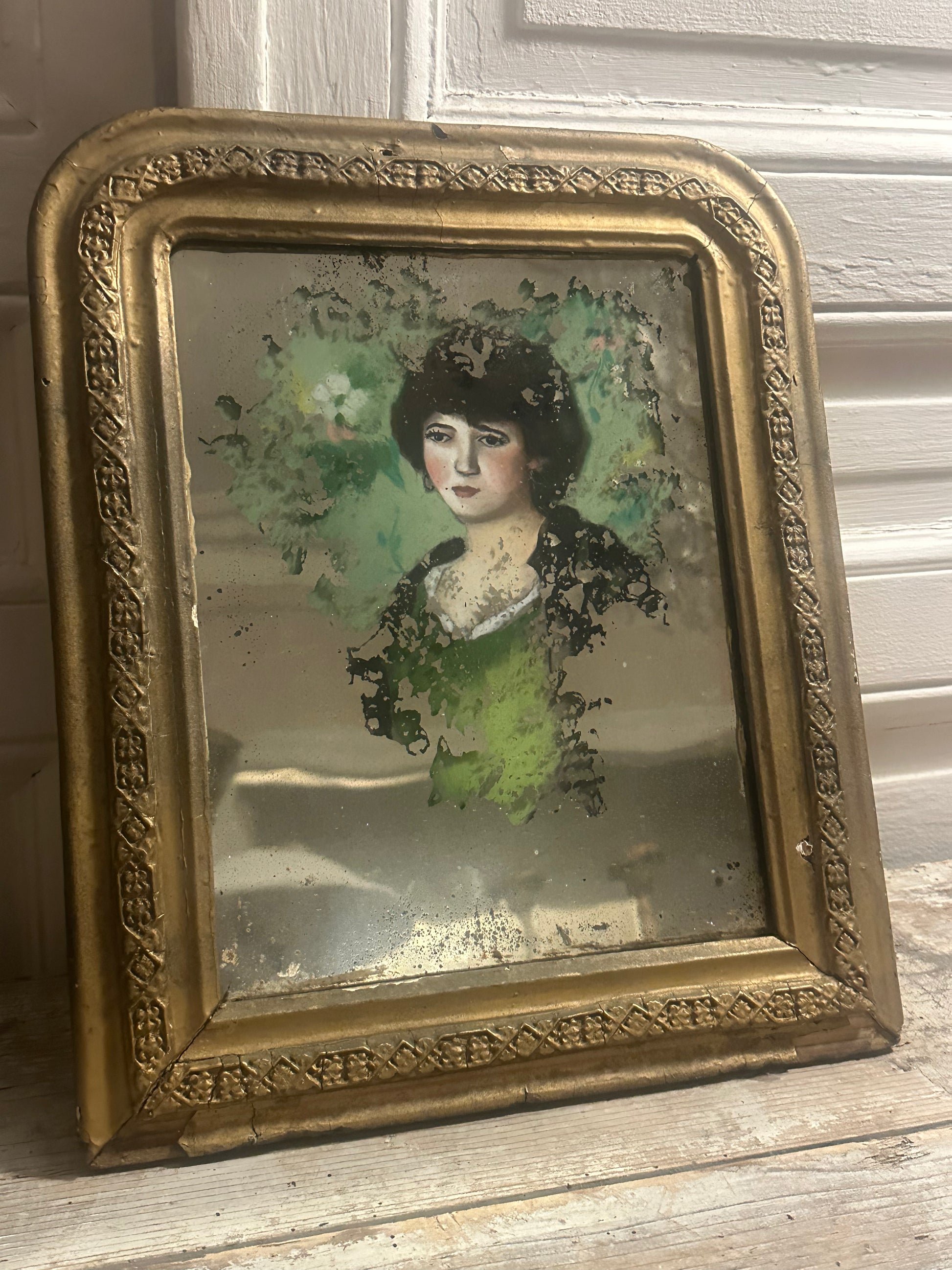 Ancien miroir mercurique louis Philipe en bois et plâtre sous lequel est glissé un dessin au pastel