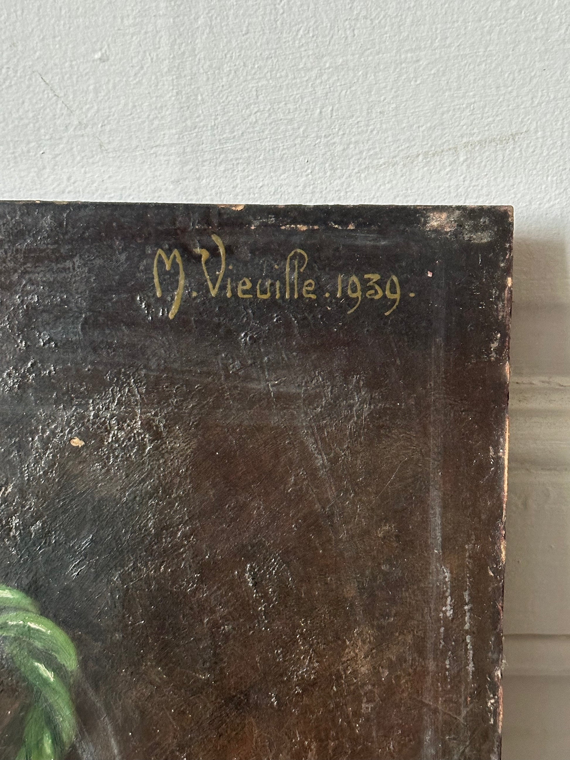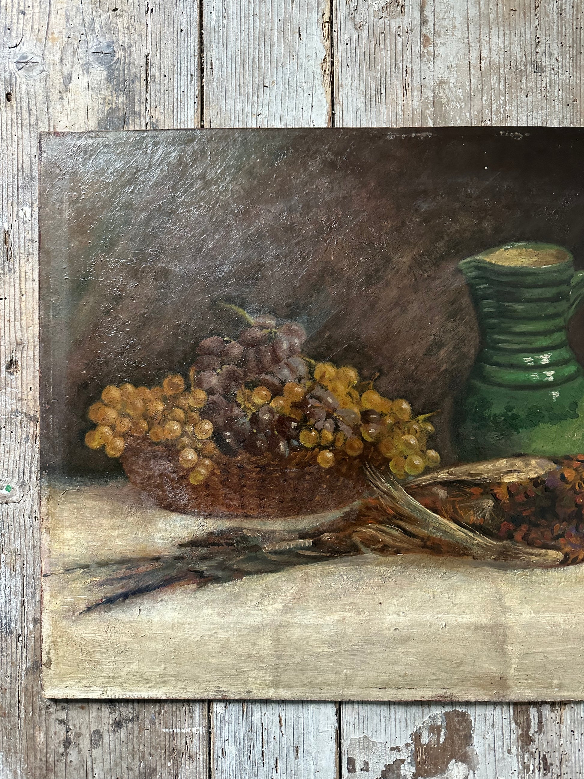 Belle nature morte ancienne représentant un faisan, une corbeille de raisins et un pichet vernissé vert.