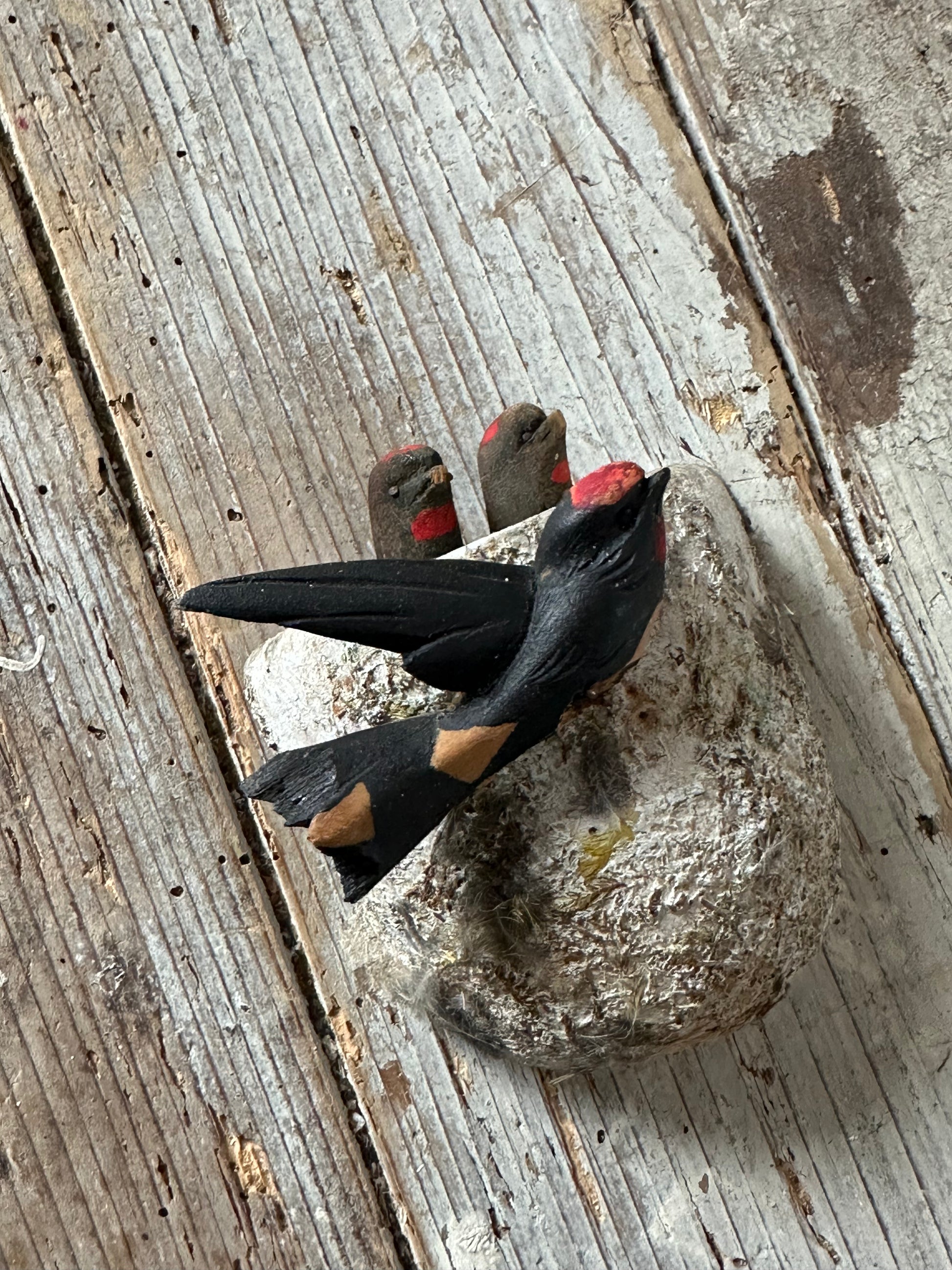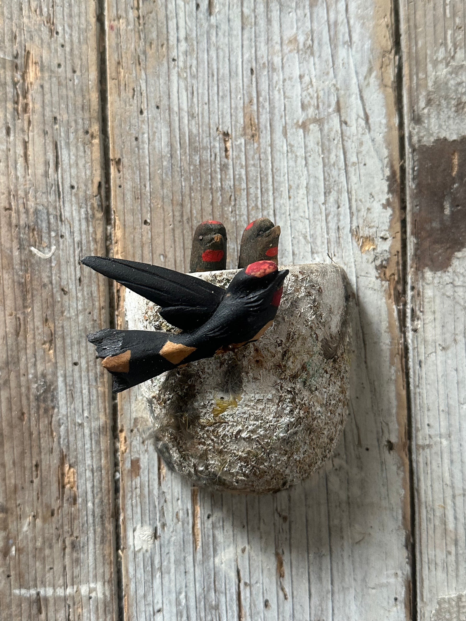Charmante hirondelle murale ancienne en bois sculpté et peint, représentée en vol au-dessus de son nid avec deux oisillons.