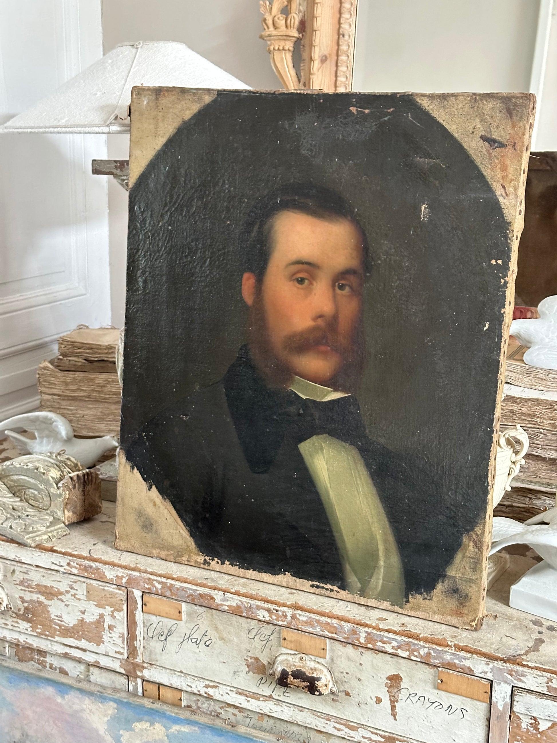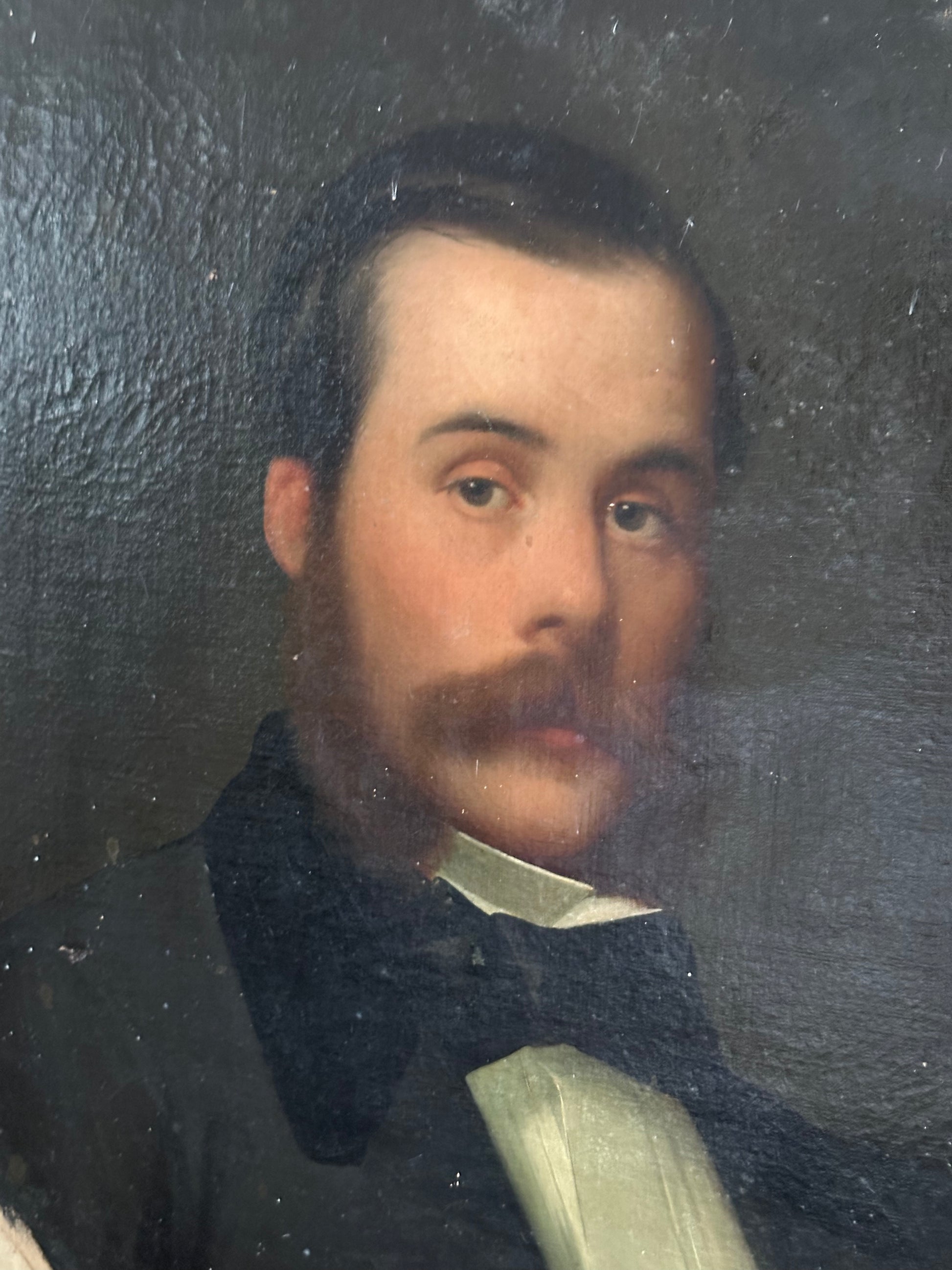 Élégant portrait masculin ancien peint à l’huile sur toile, représentant un homme moustachu en buste, traité dans un format médaillon caractéristique des portraits bourgeois du XIXᵉ siècle.