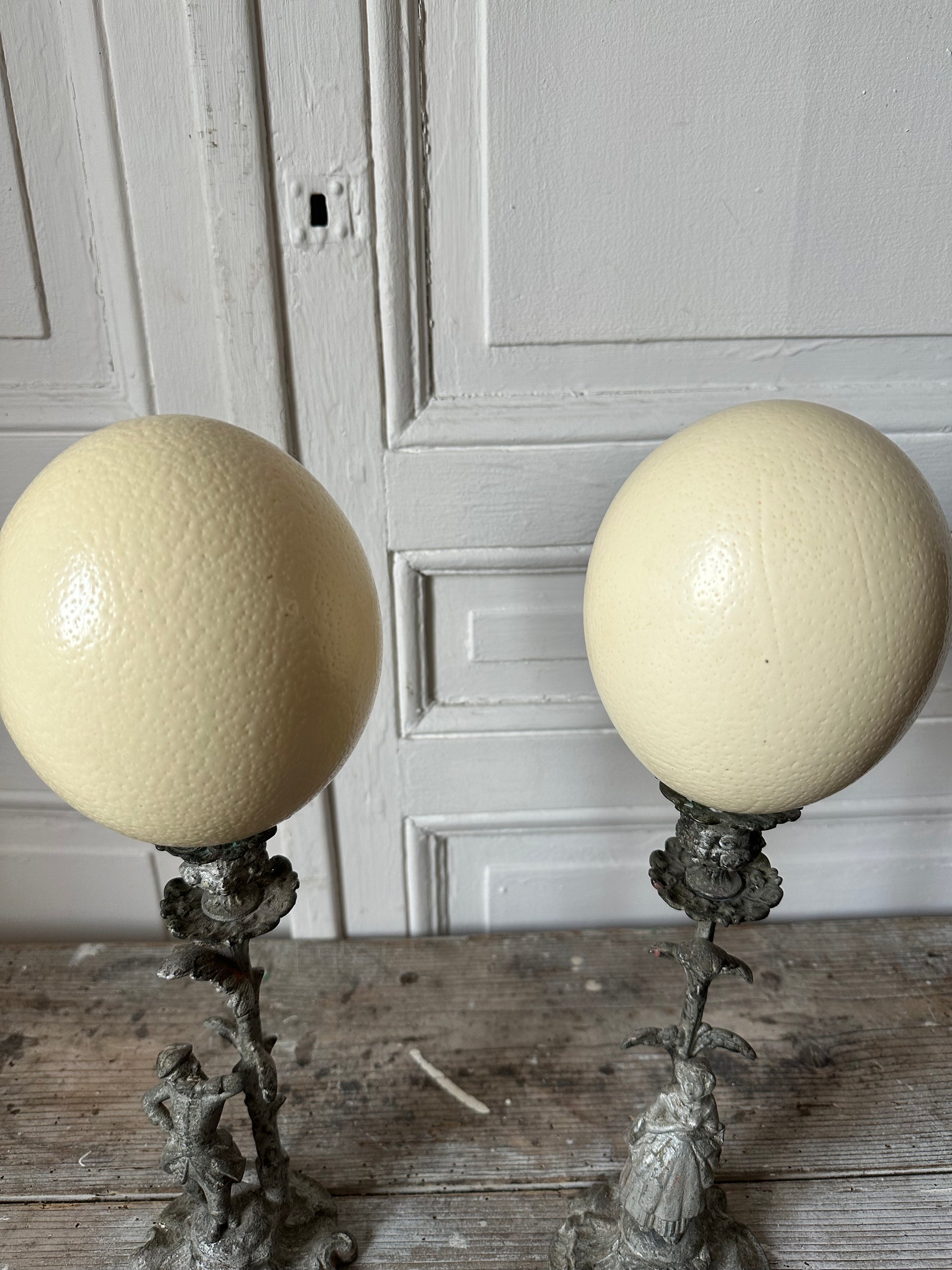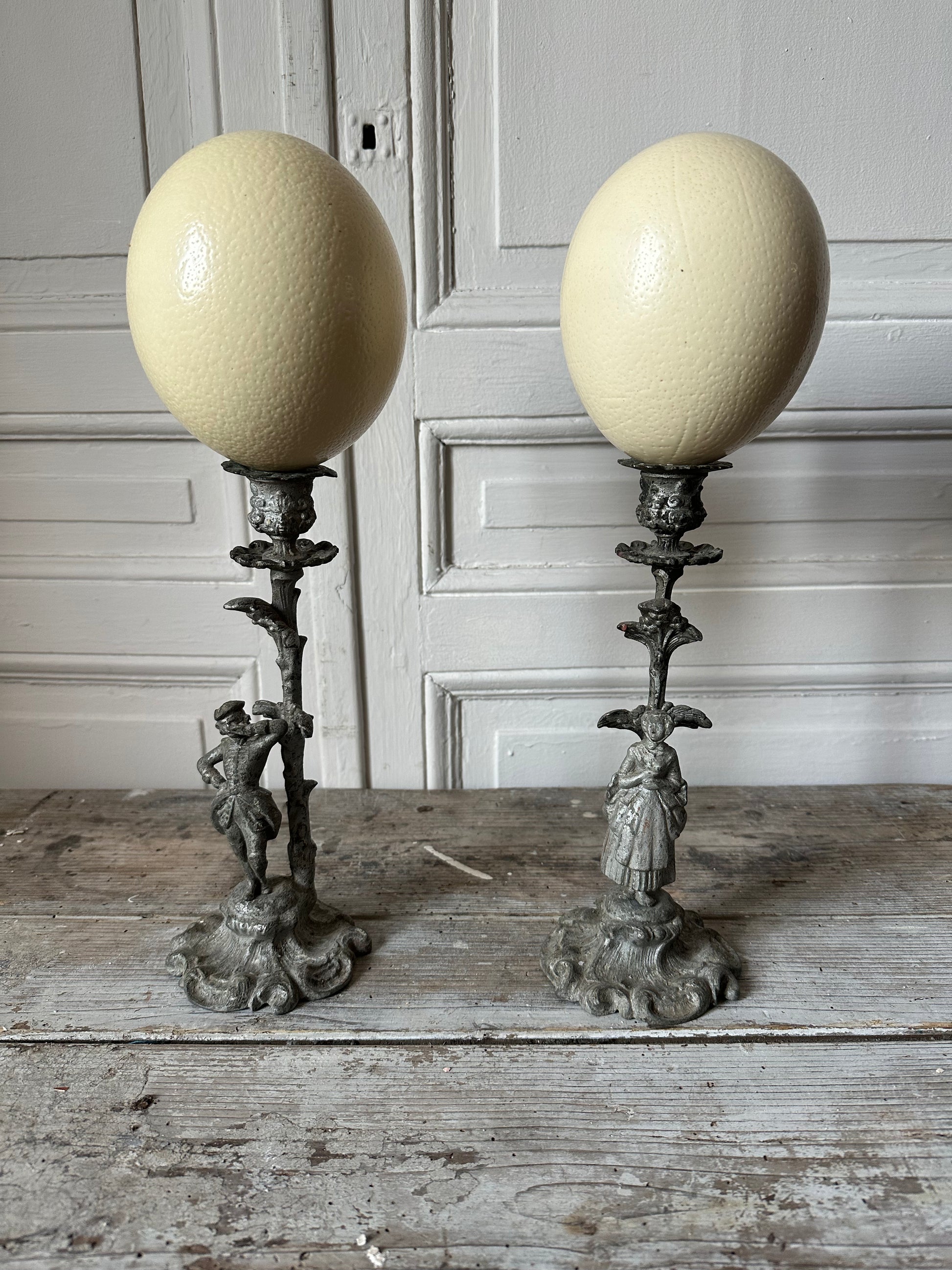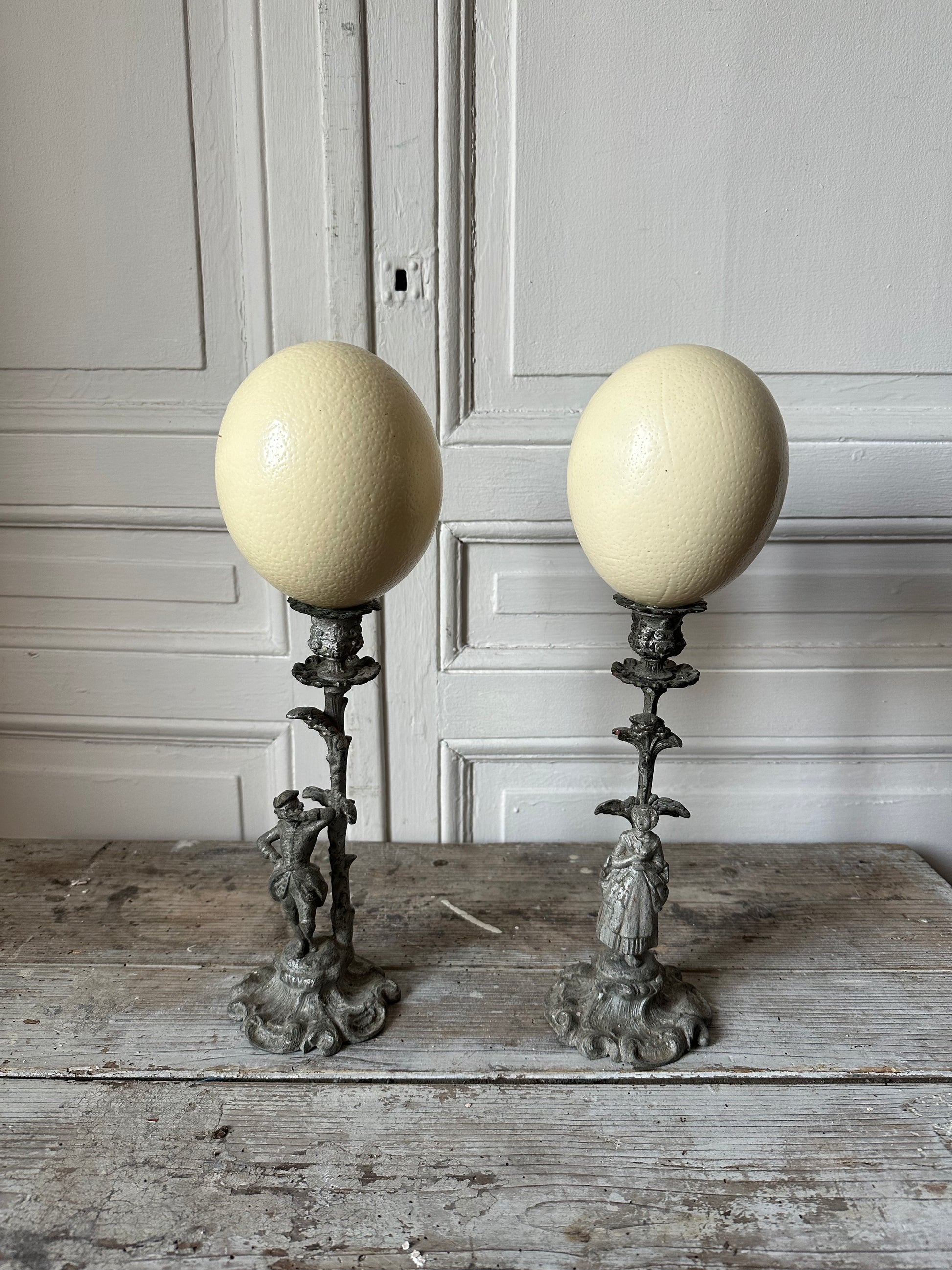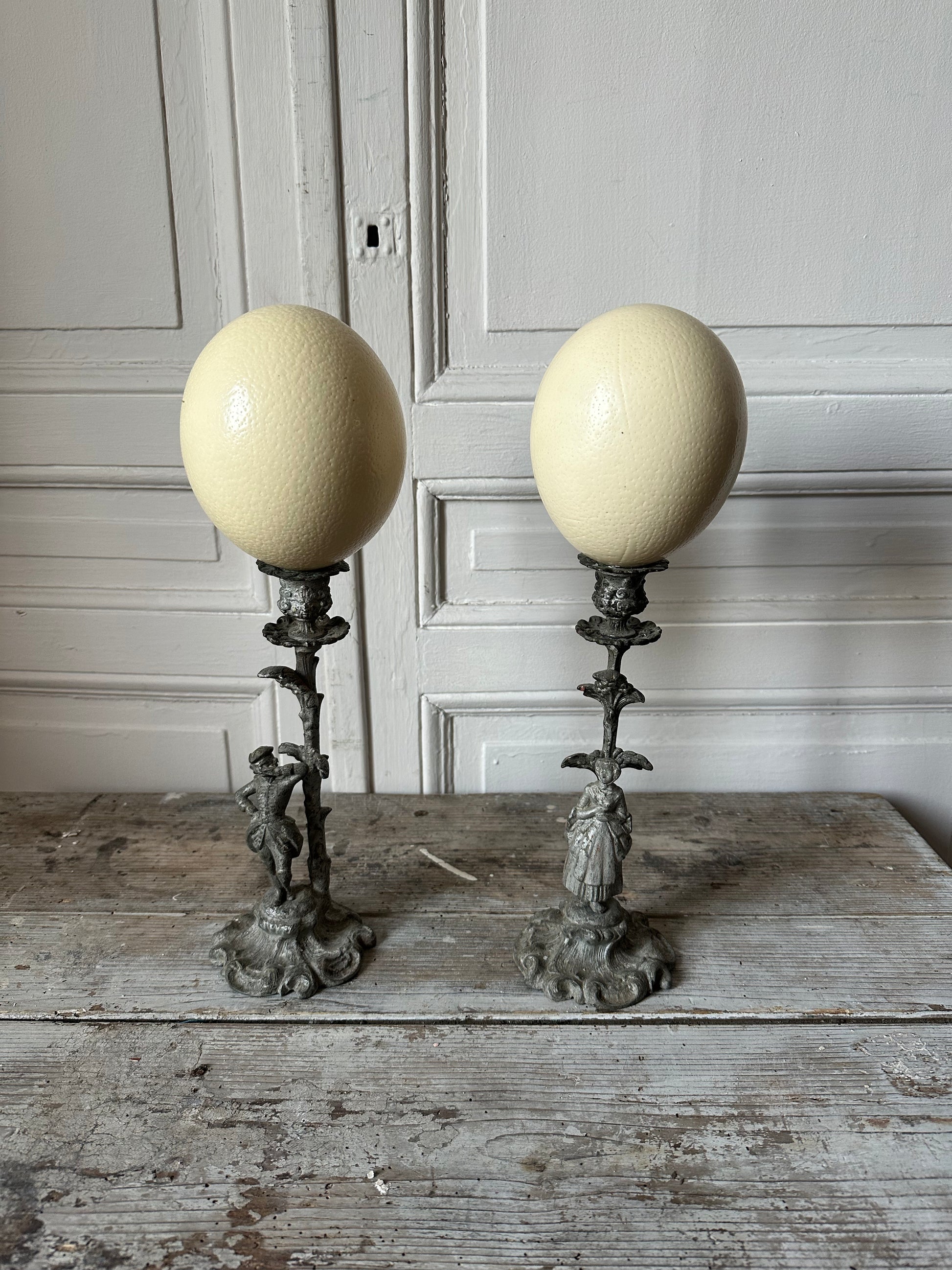 Paire d’œufs d’autruche sur socle {anciens bougeoirs }