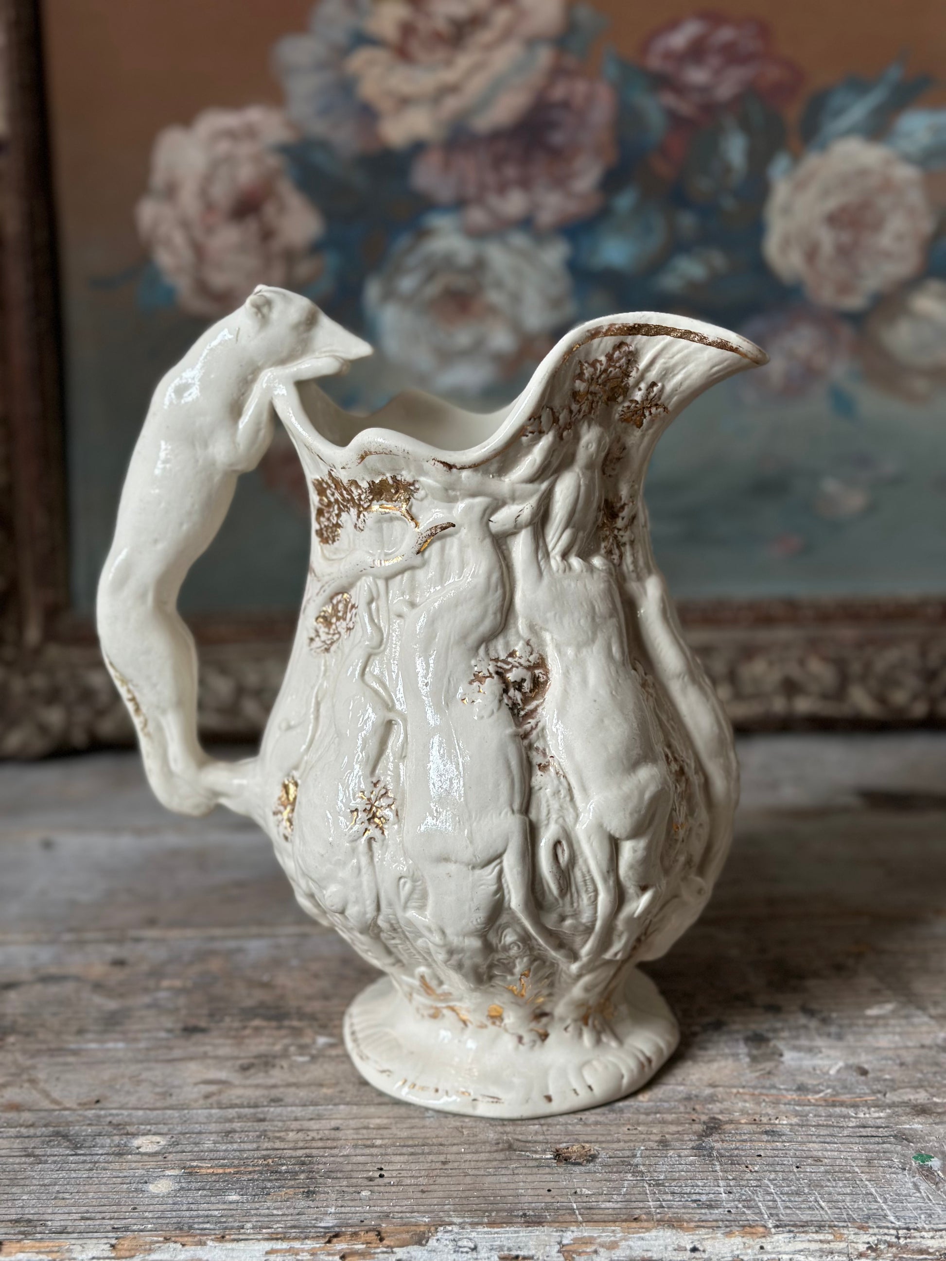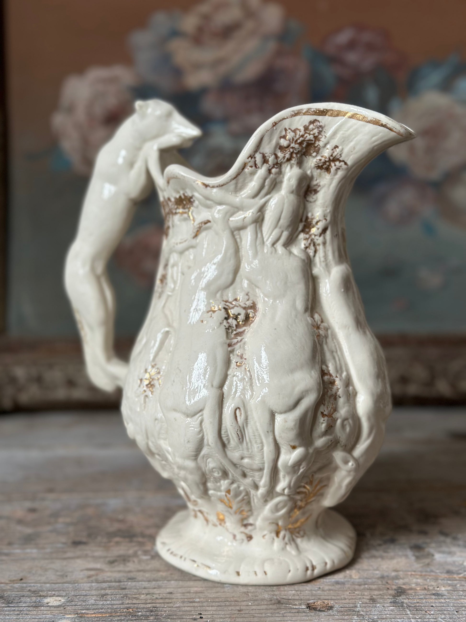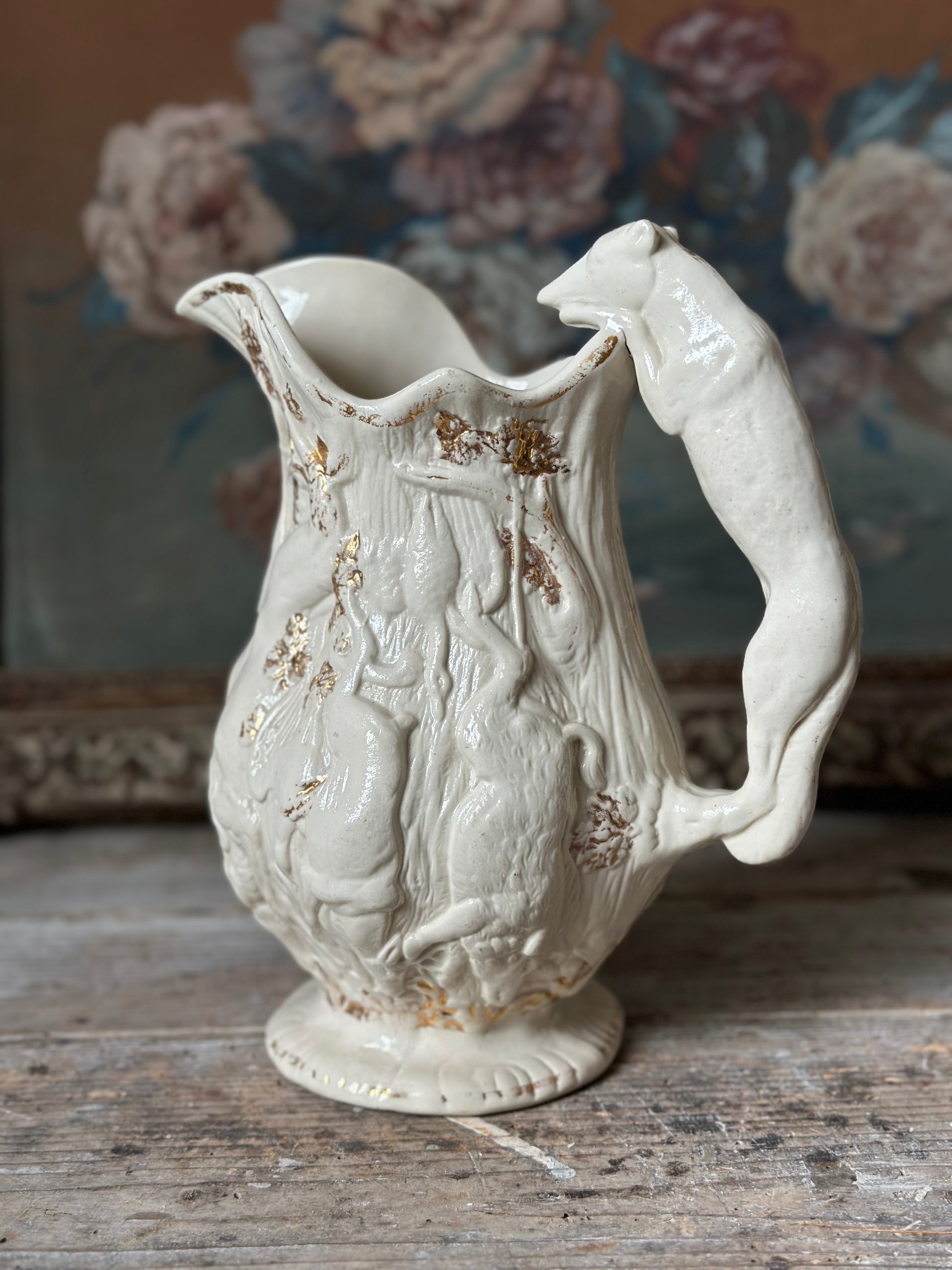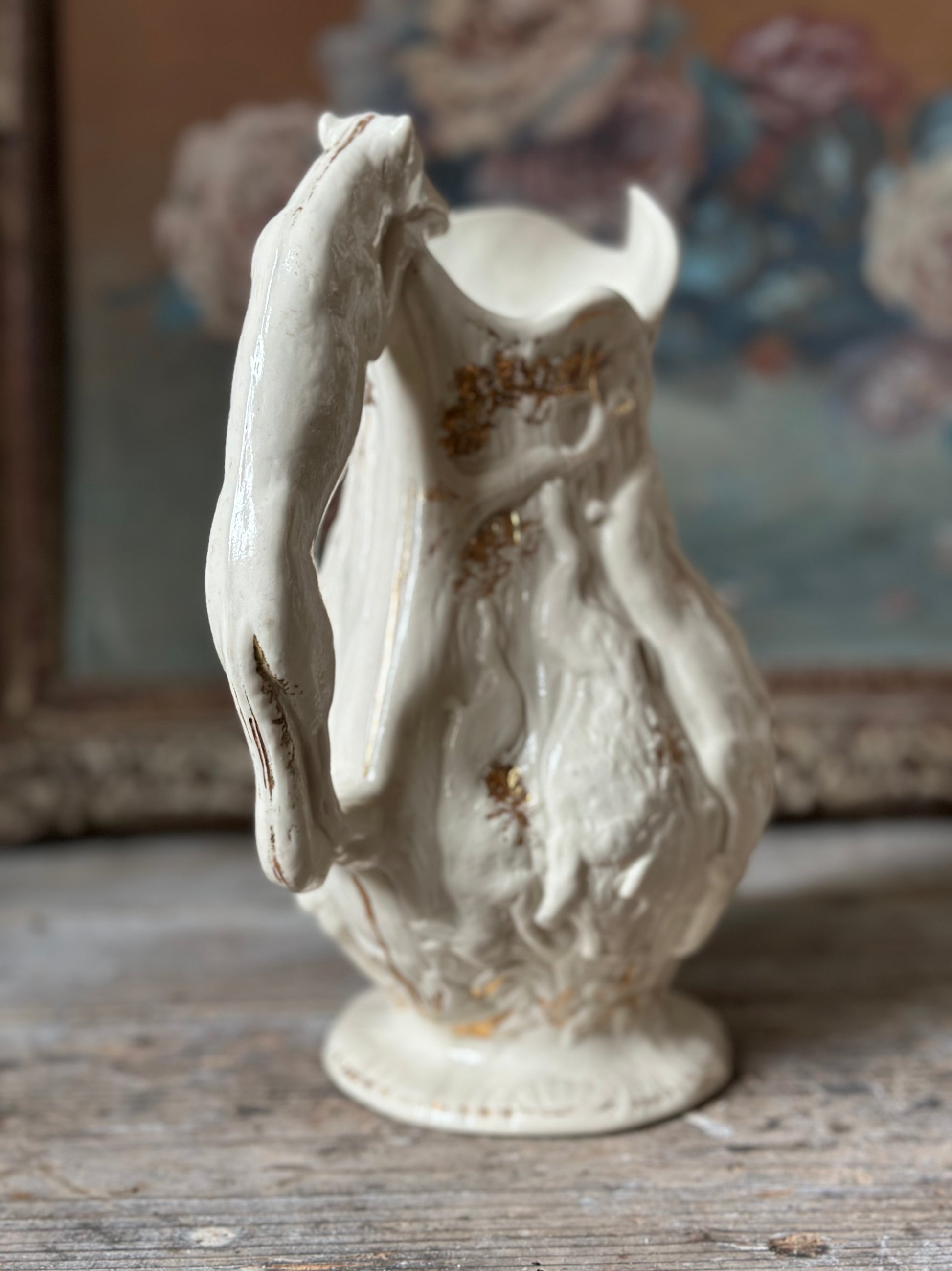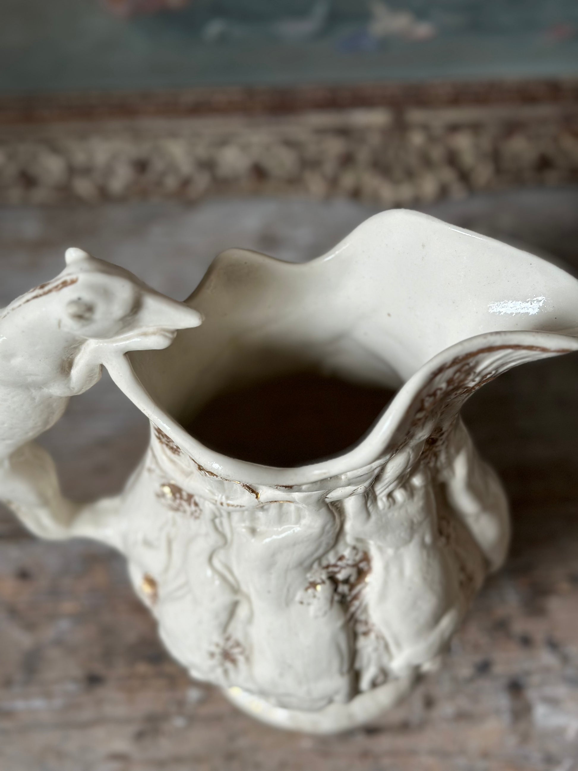 Pichet antique zoomorphe en faïence crème et dorure