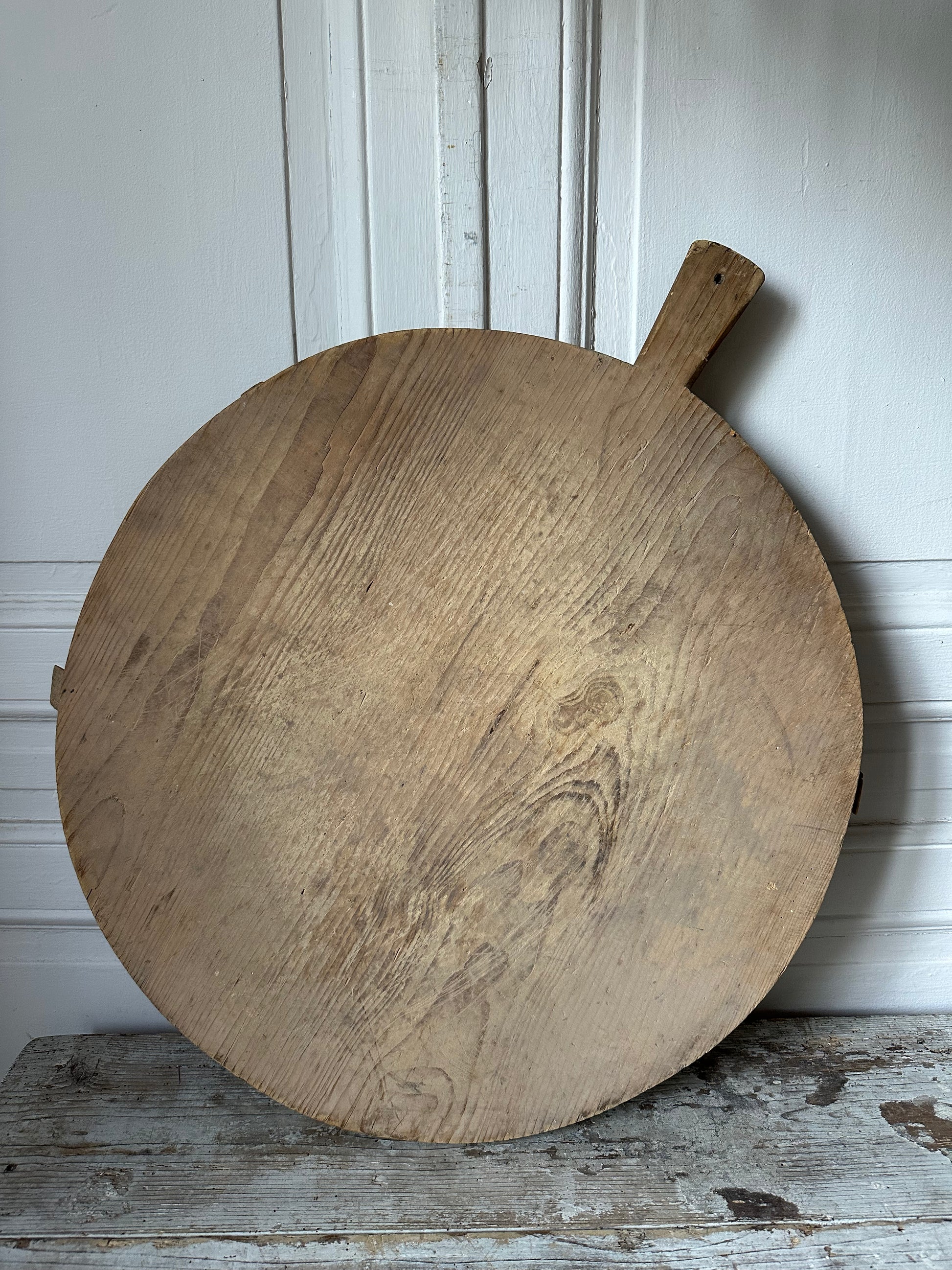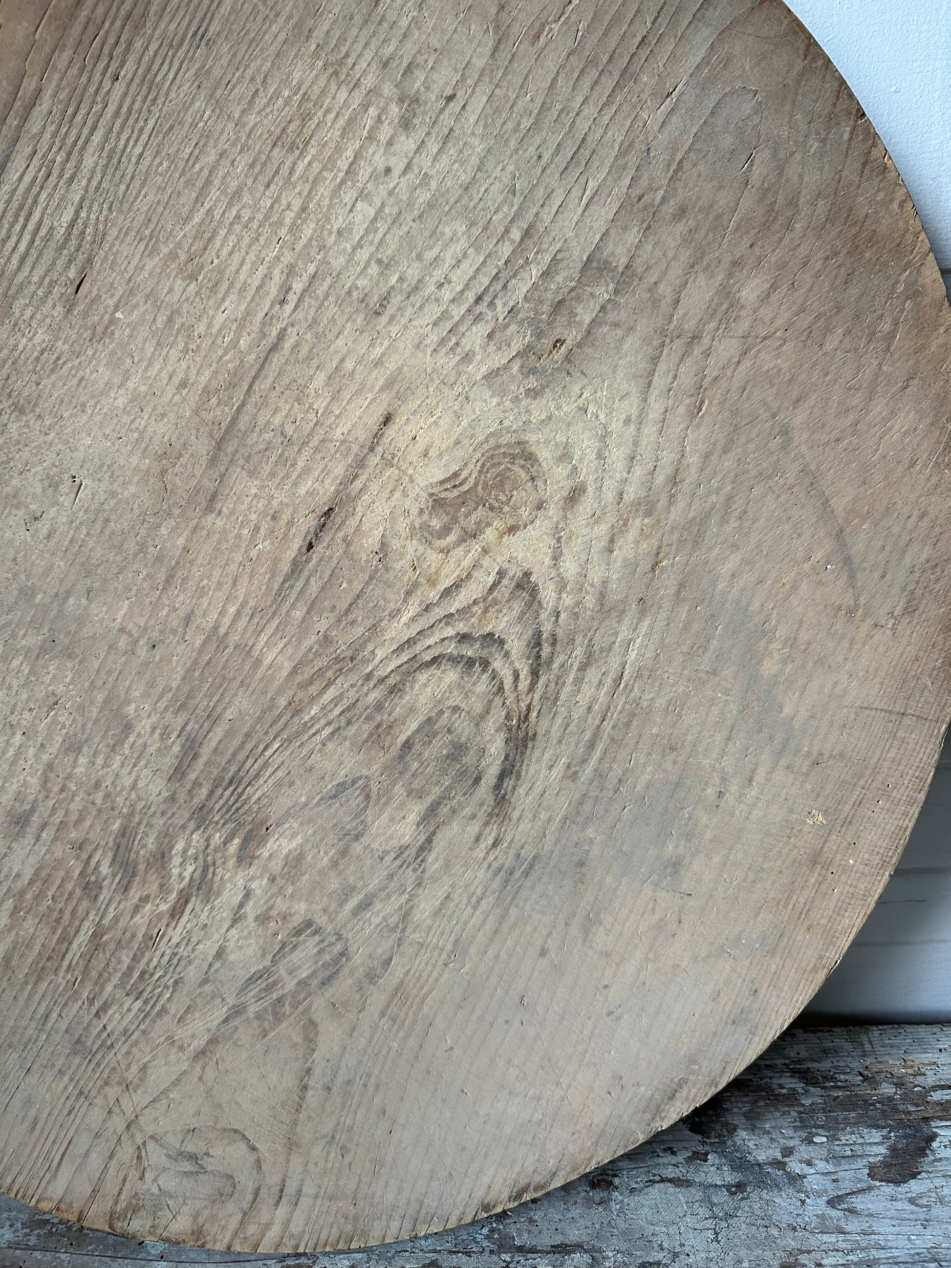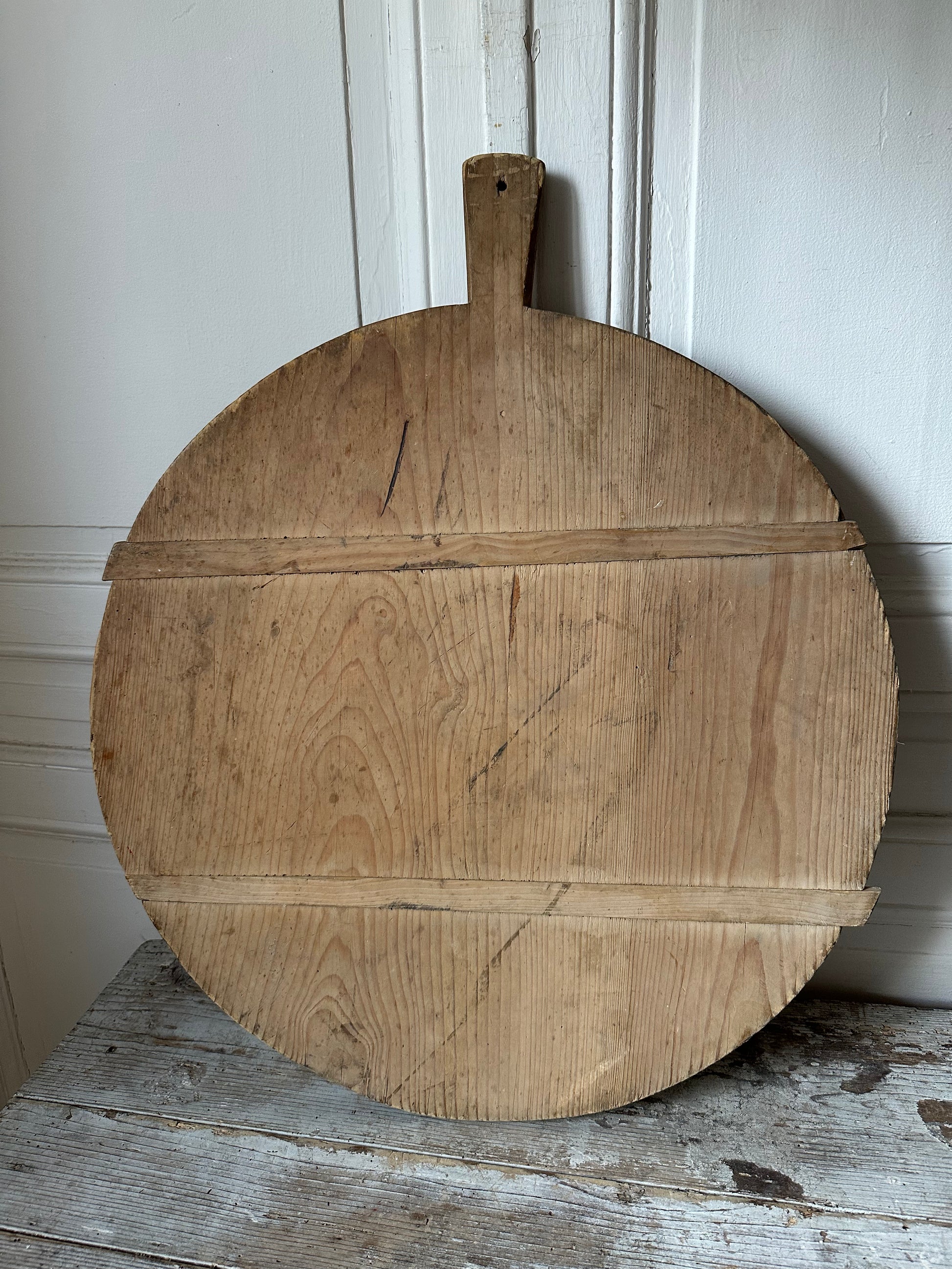 Superbe grande planche à pain ancienne en bois massif, de forme ronde avec poignée d’origine. Très belle patine d’usage, typique des planches de cuisine traditionnelles utilisées autrefois pour travailler la pâte.