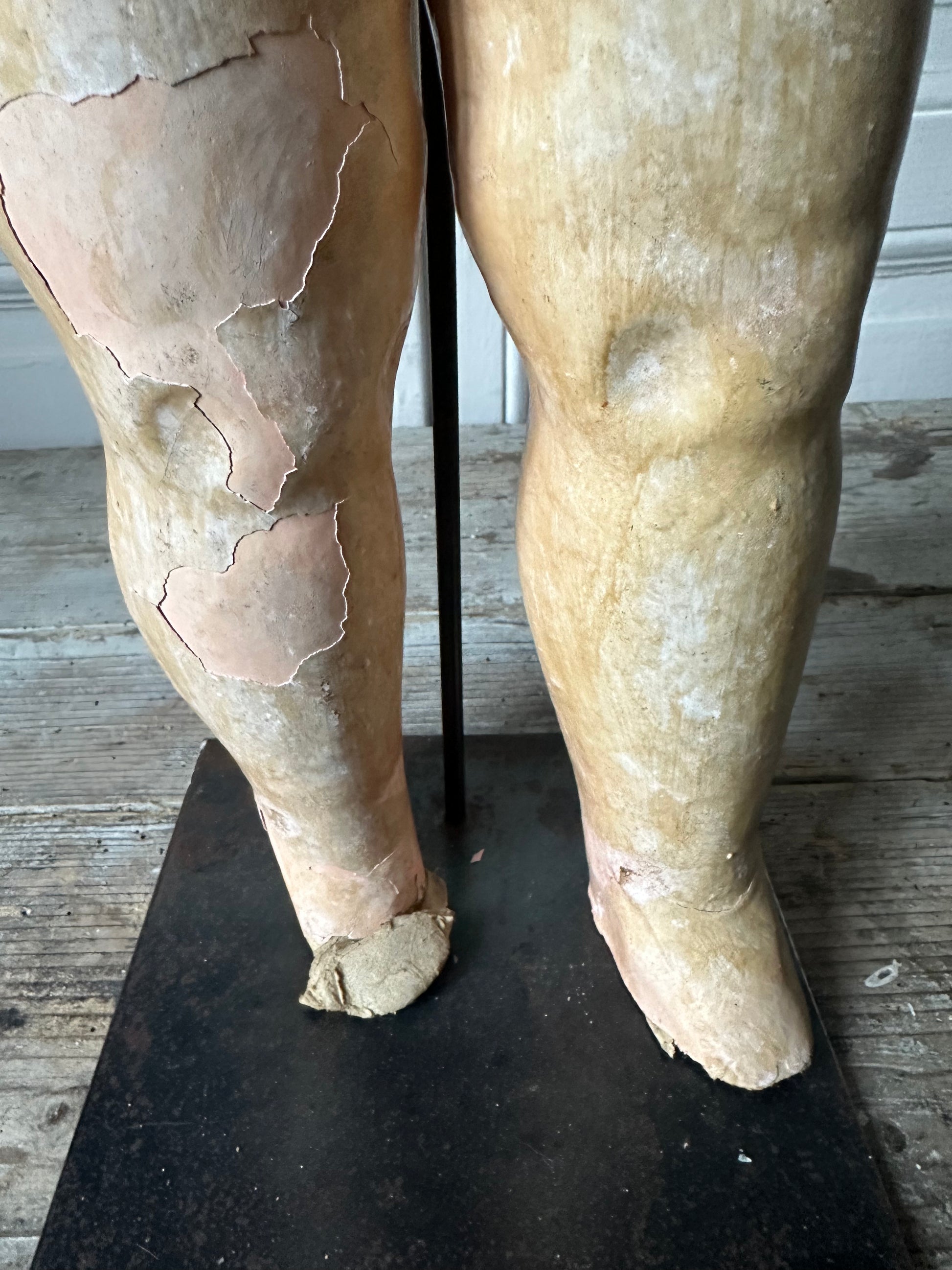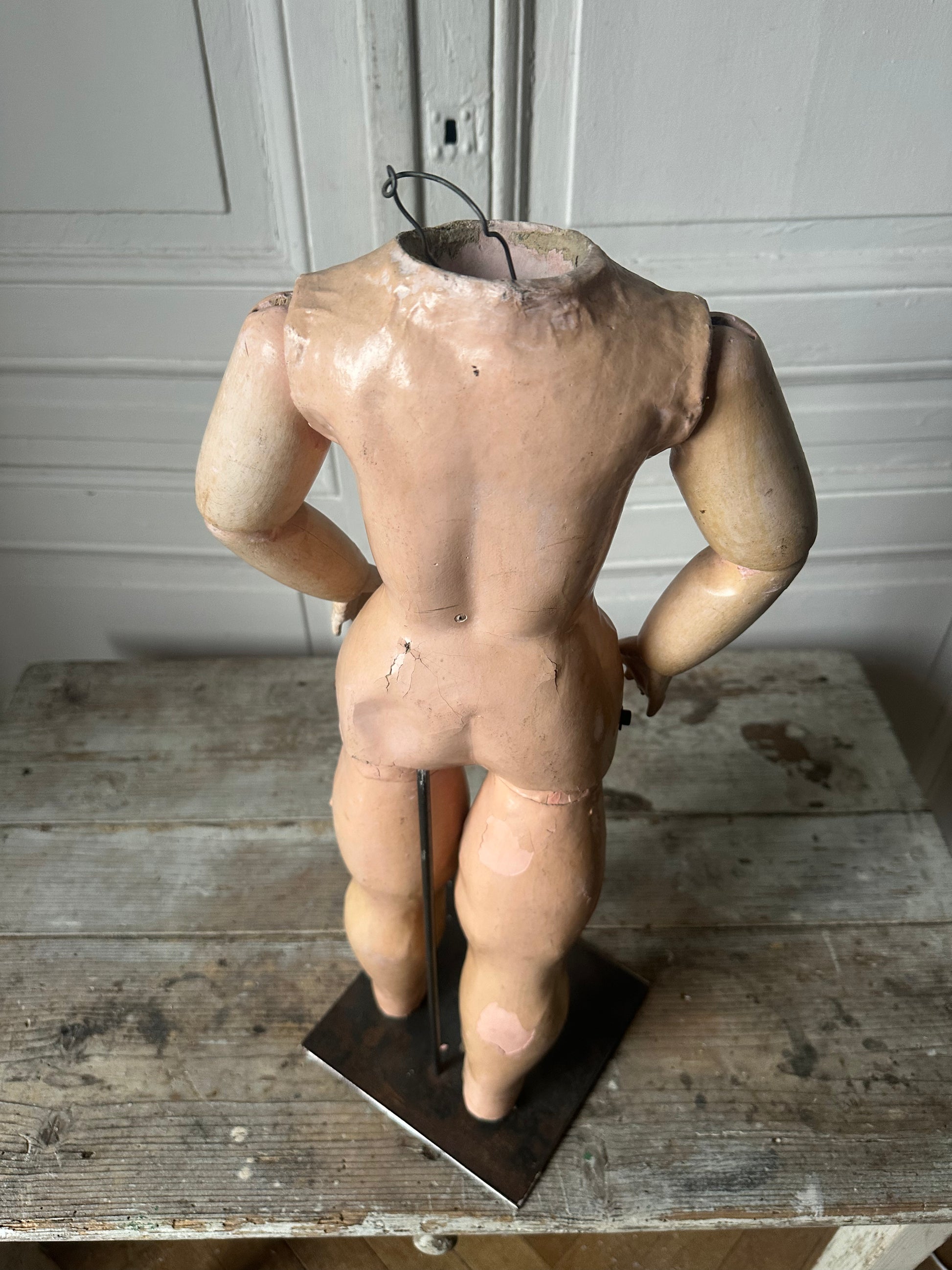 Ancien corps de poupée en carton bouilli, papier mâché sur socle