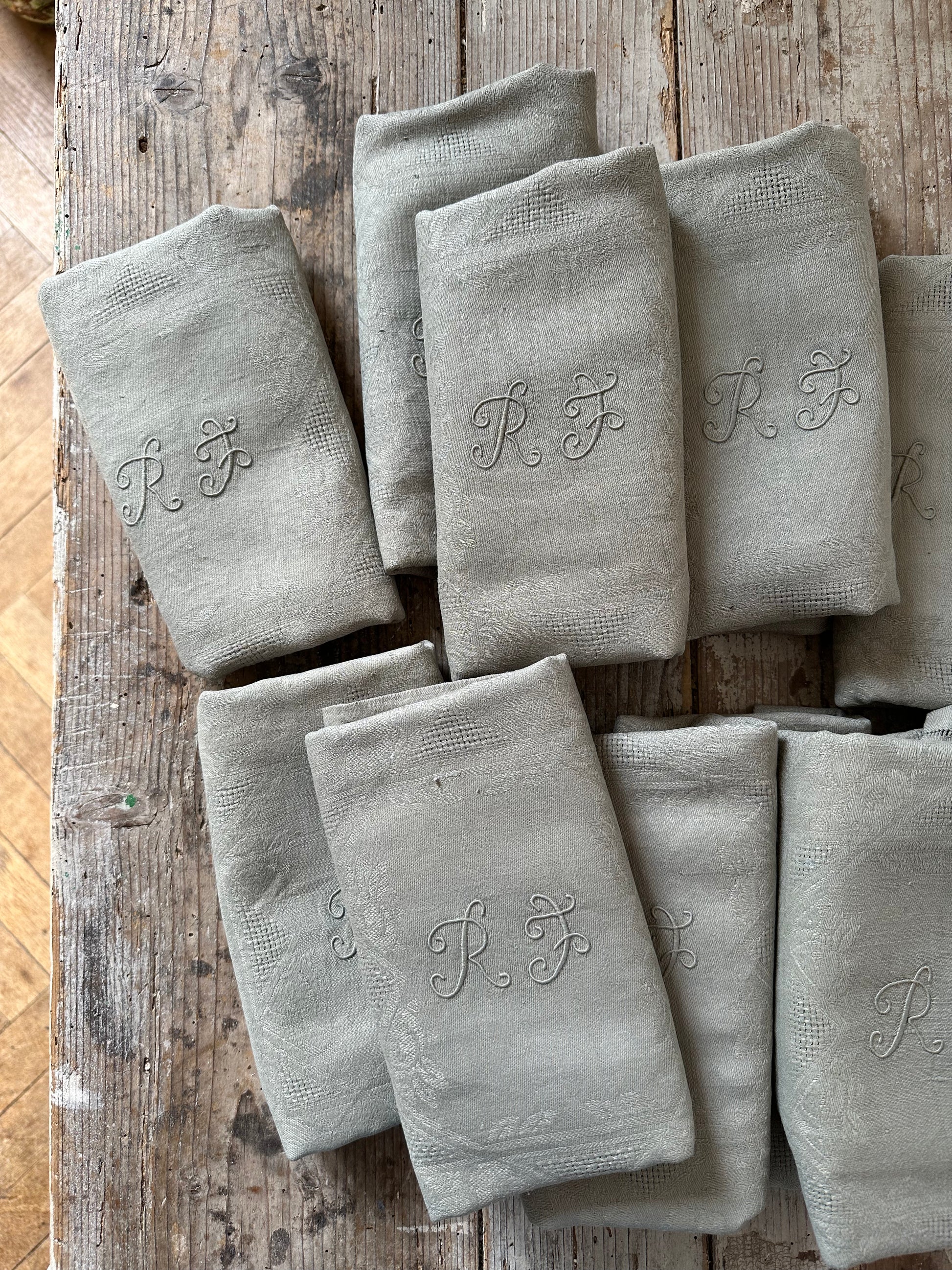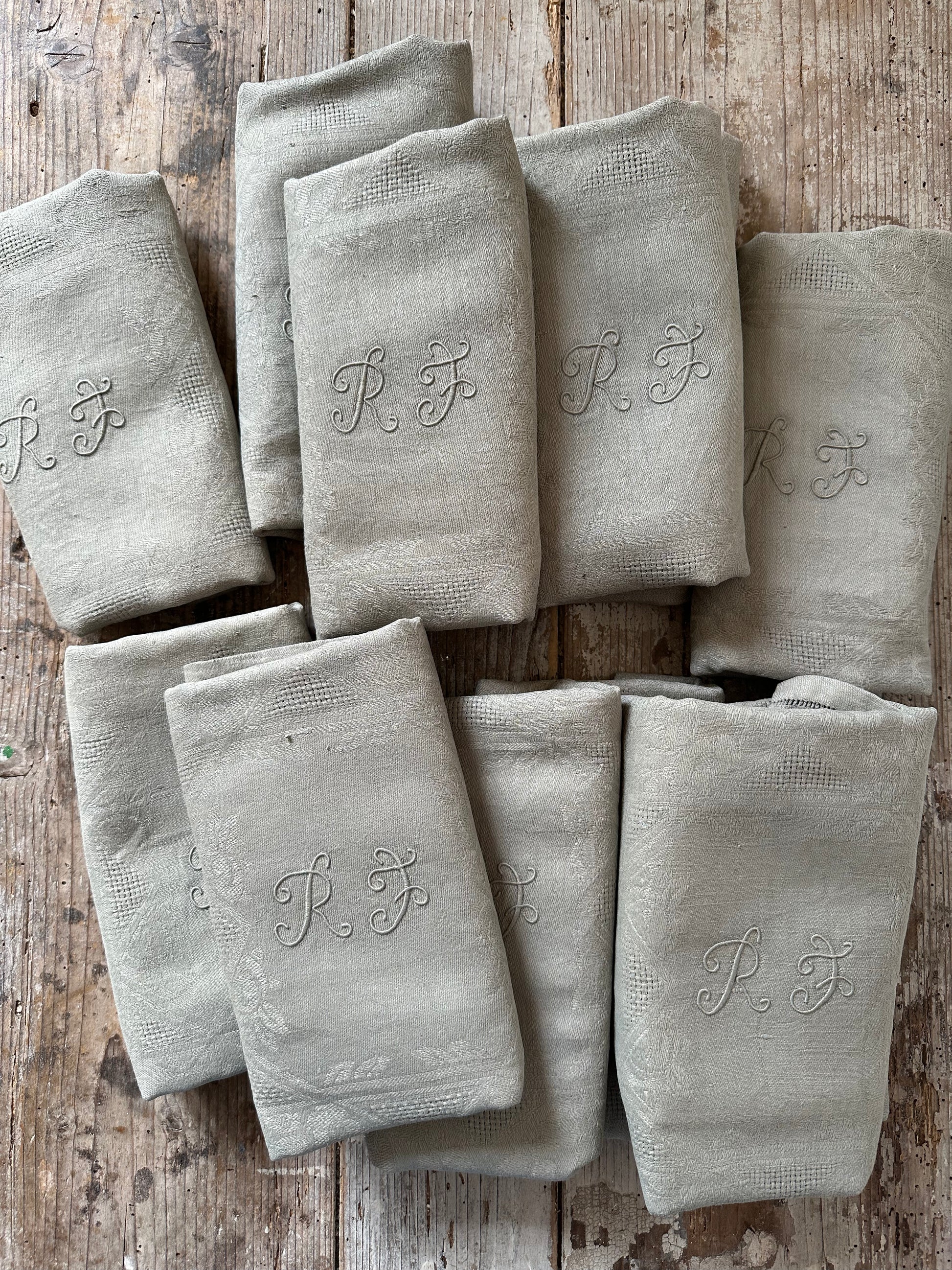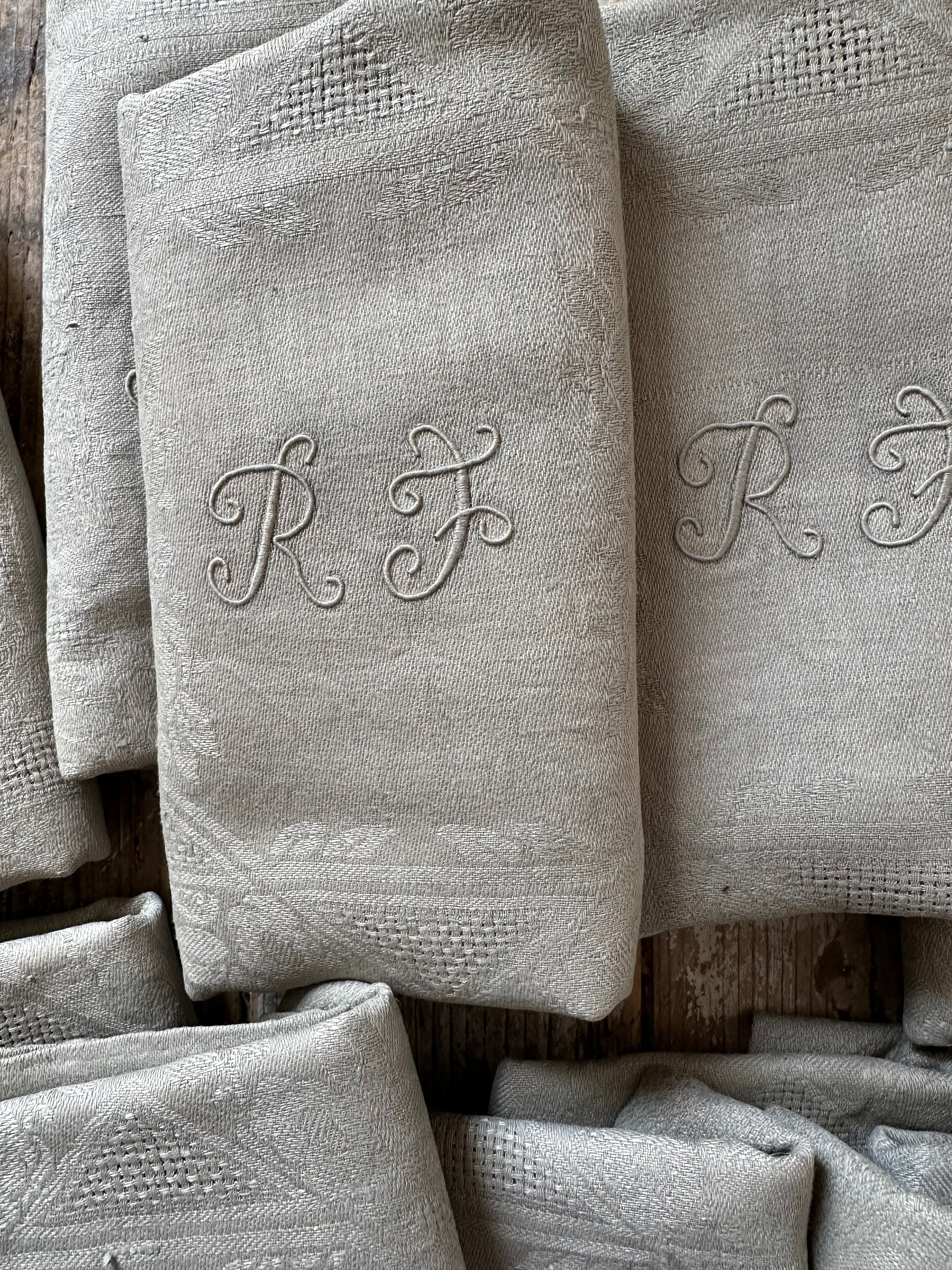 Charmante suite de 12 serviettes anciennes en damassé de lin, chacune délicatement brodée du monogramme RF en lettres entrelacées.