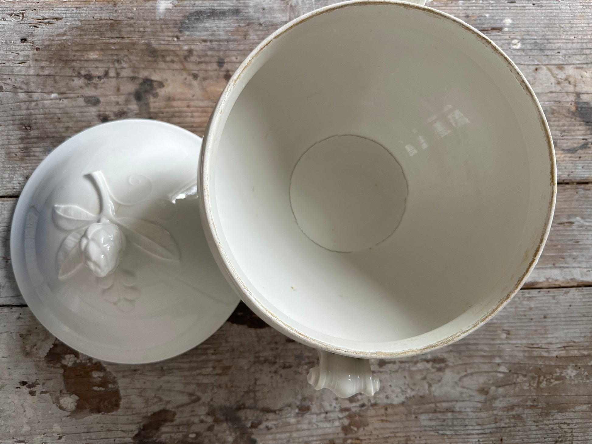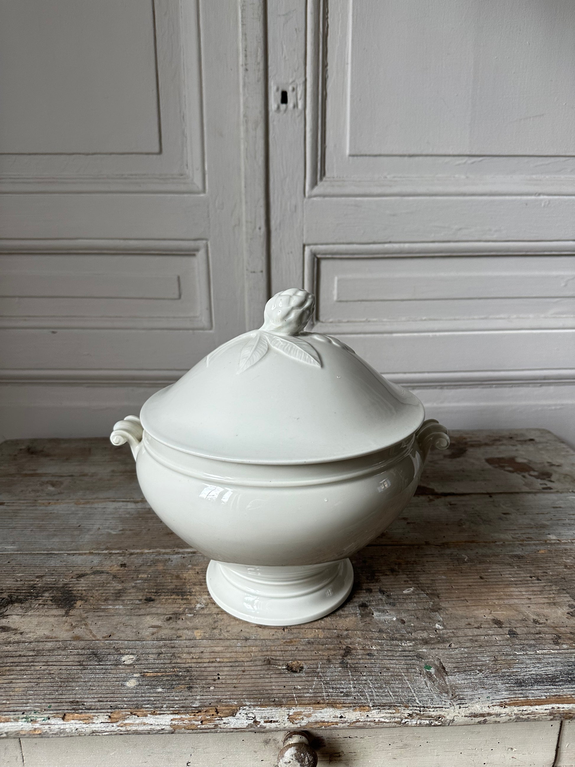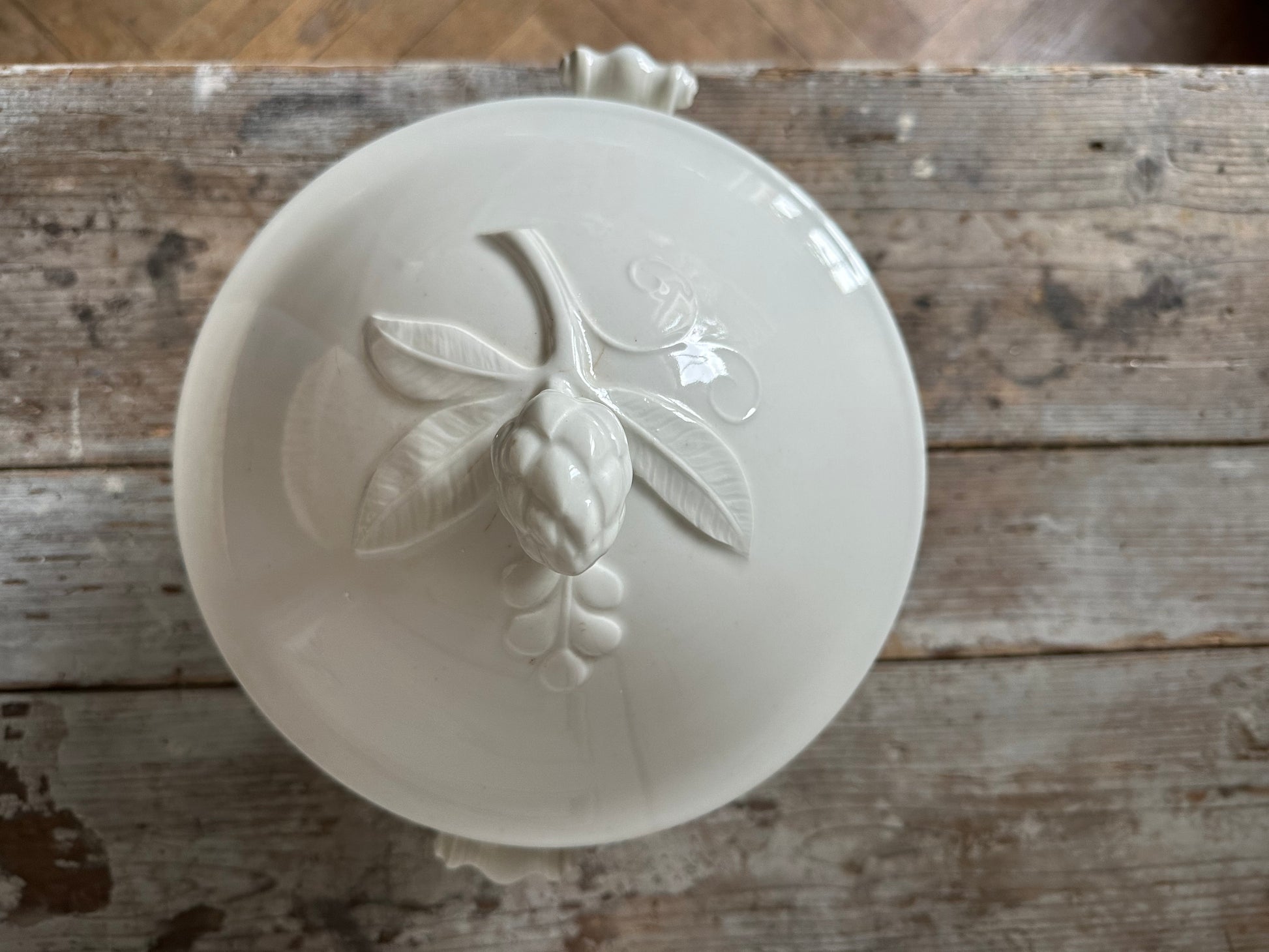 Élégante soupière ancienne en faïence blanche, reposant sur un piédouche, avec couvercle surmonté d’un bouton décoratif en forme de fruit et feuillage.